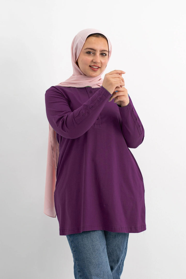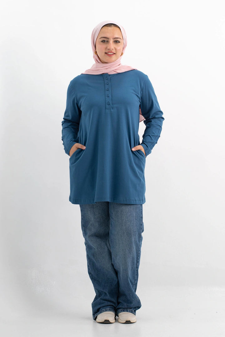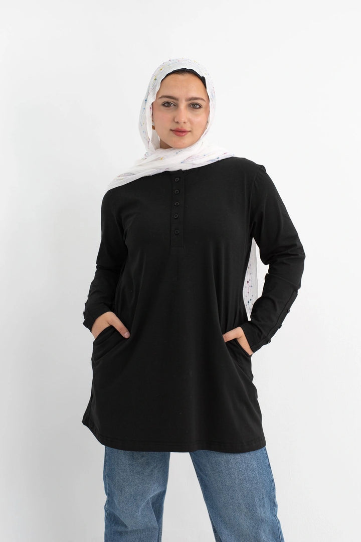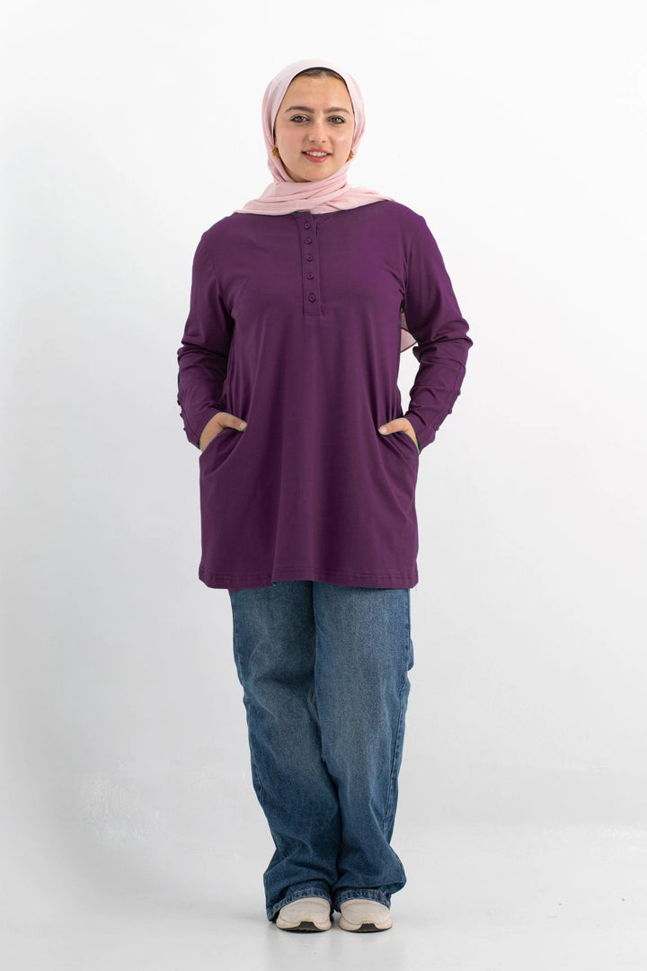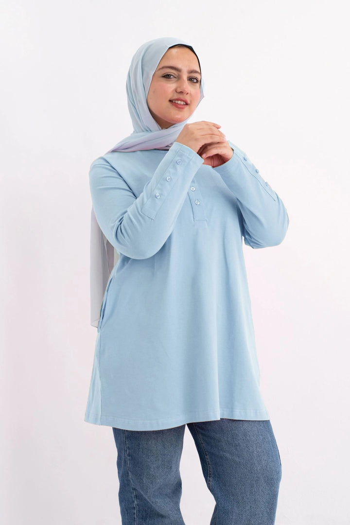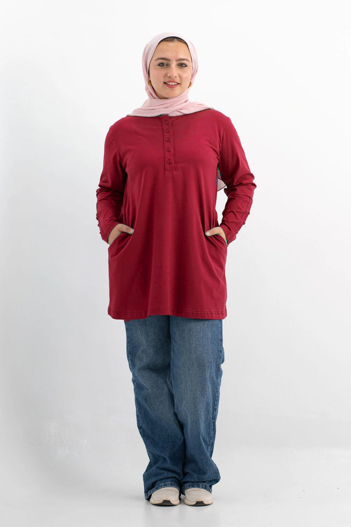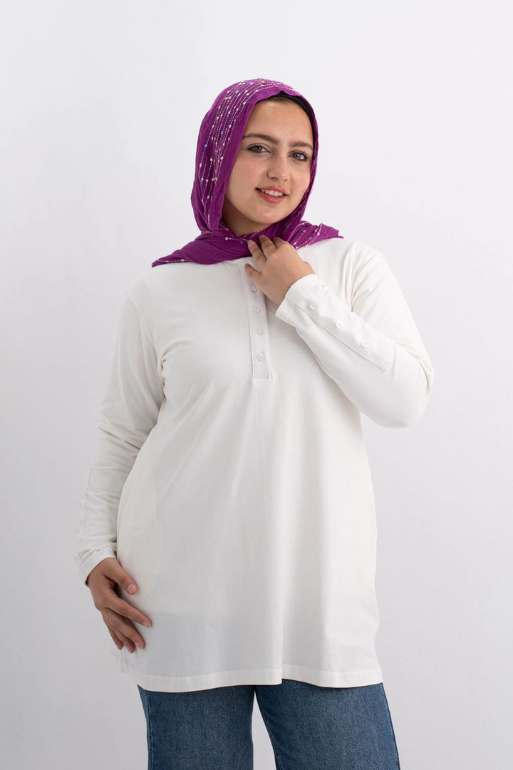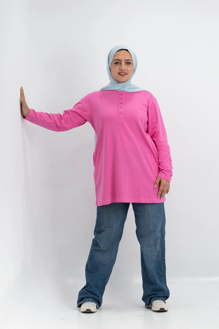 تي شيرت 100% قطن برقبه دائريه وزراير وفي جايبين علي الجوانب وفي نهايه الكم زراير لإضفاء لمسه جماليه