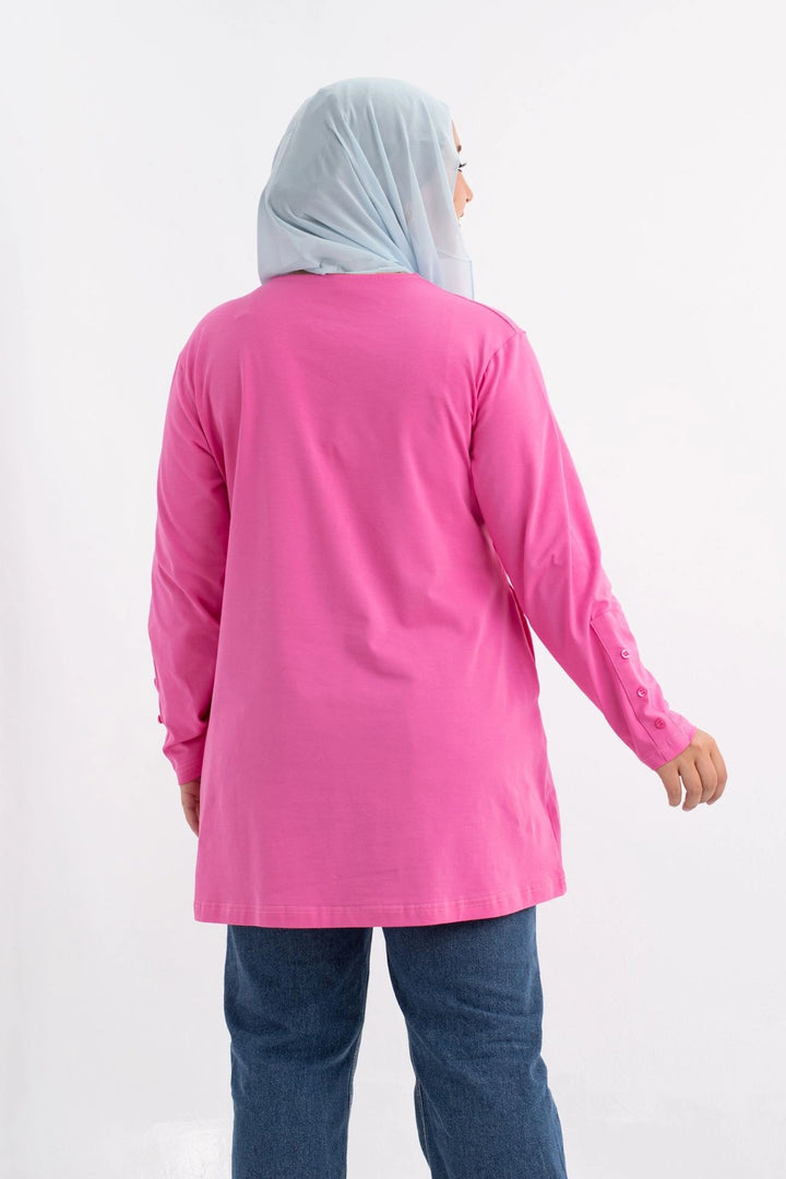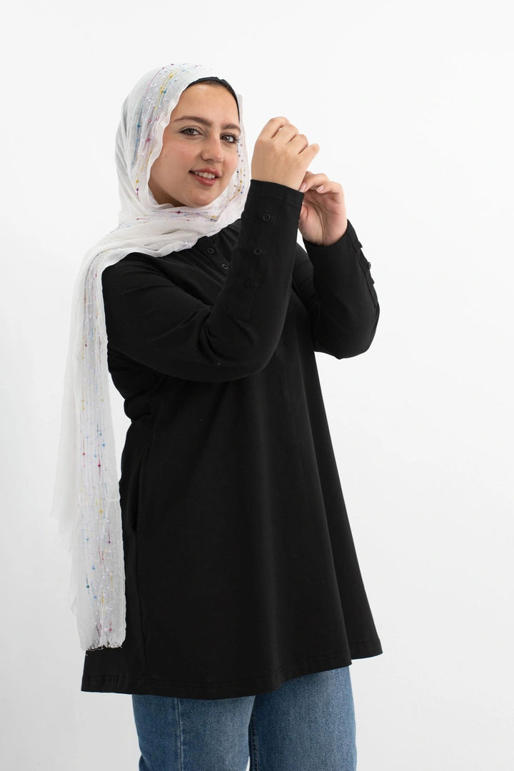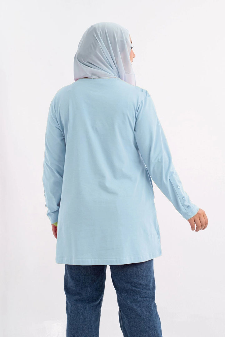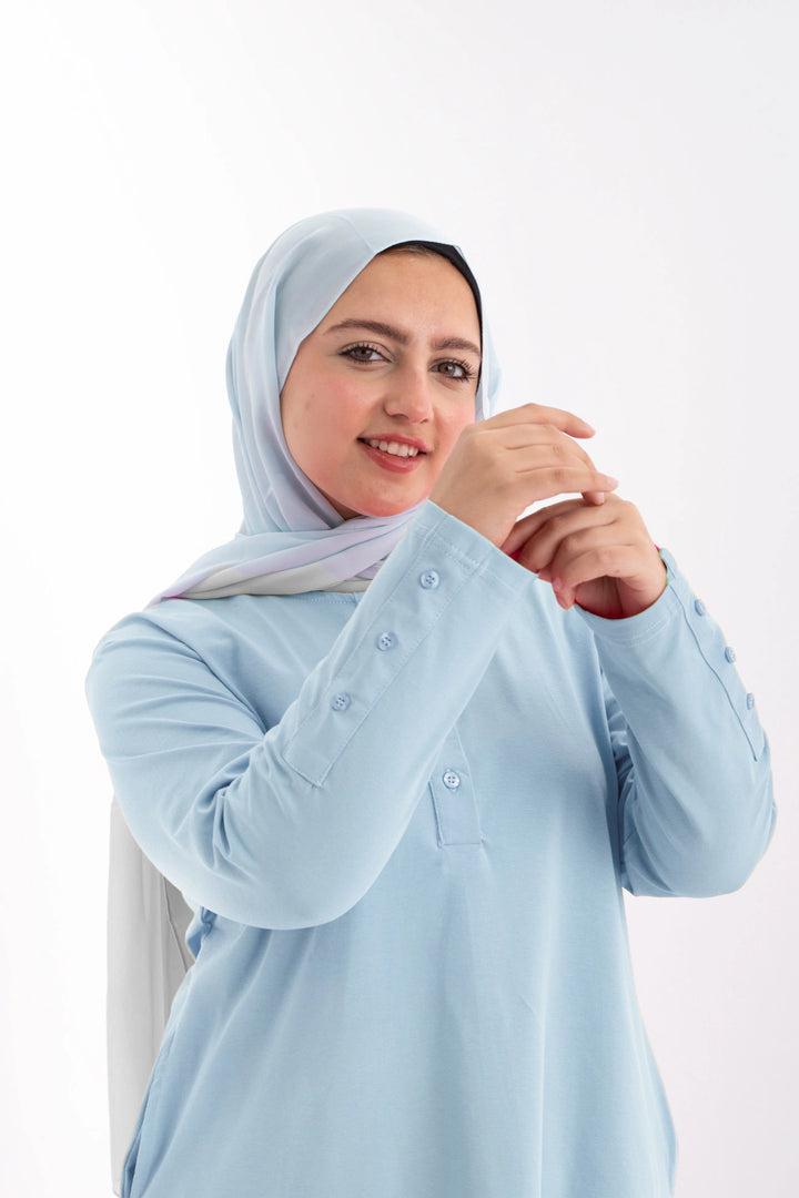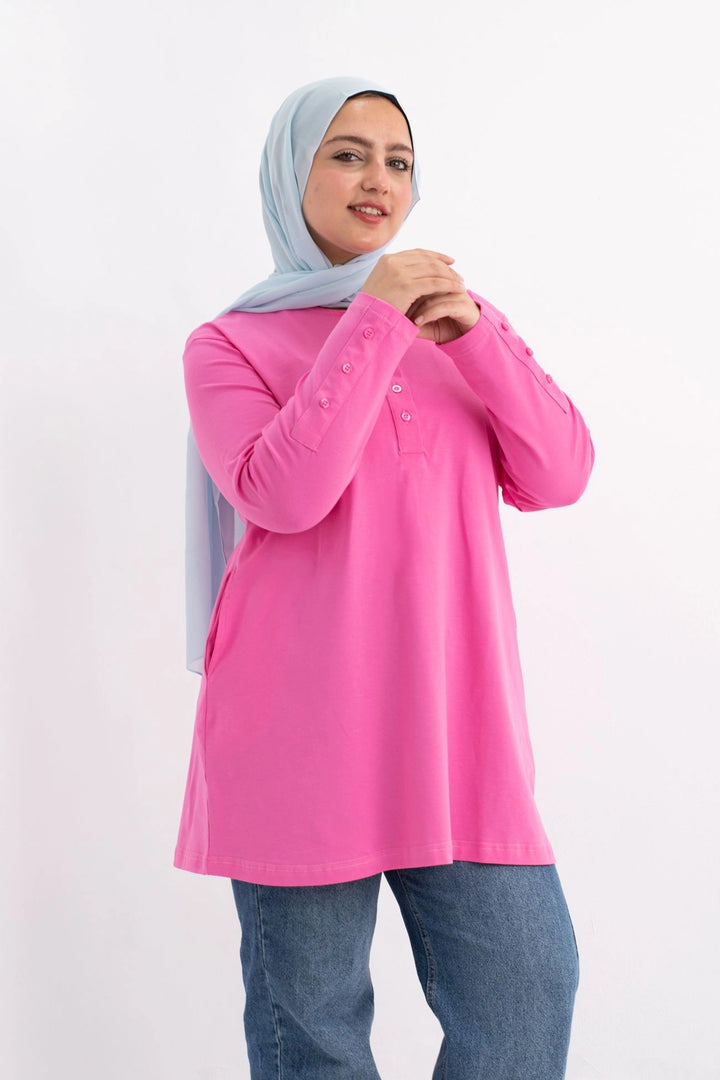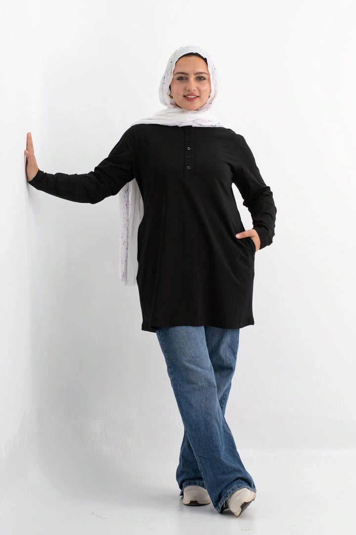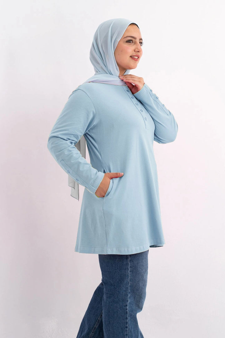 تي شيرت 100% قطن برقبه دائريه وزراير وفي جايبين علي الجوانب وفي نهايه الكم زراير لإضفاء لمسه جماليه