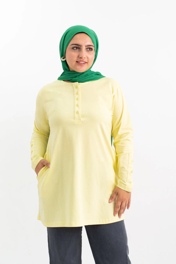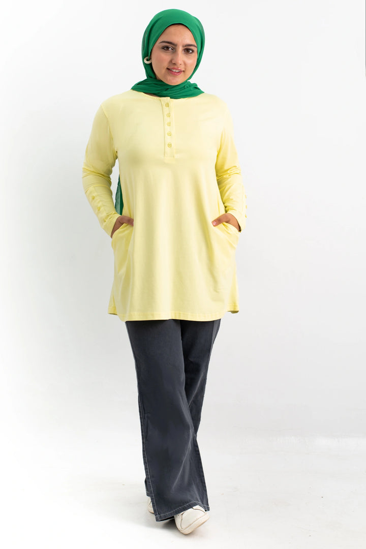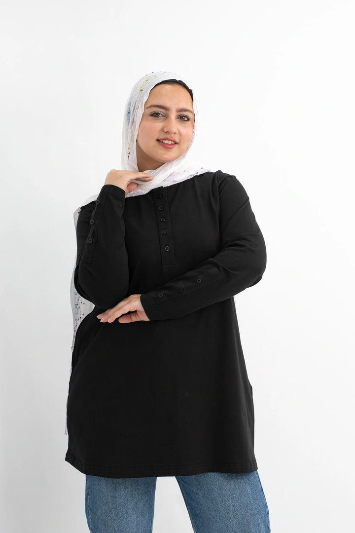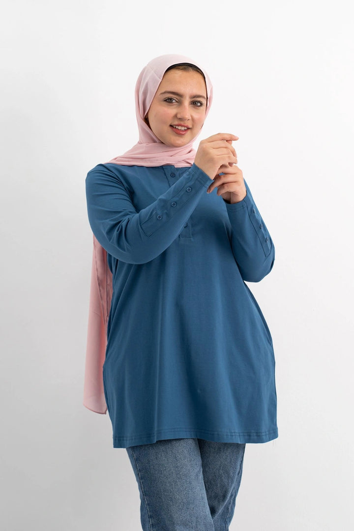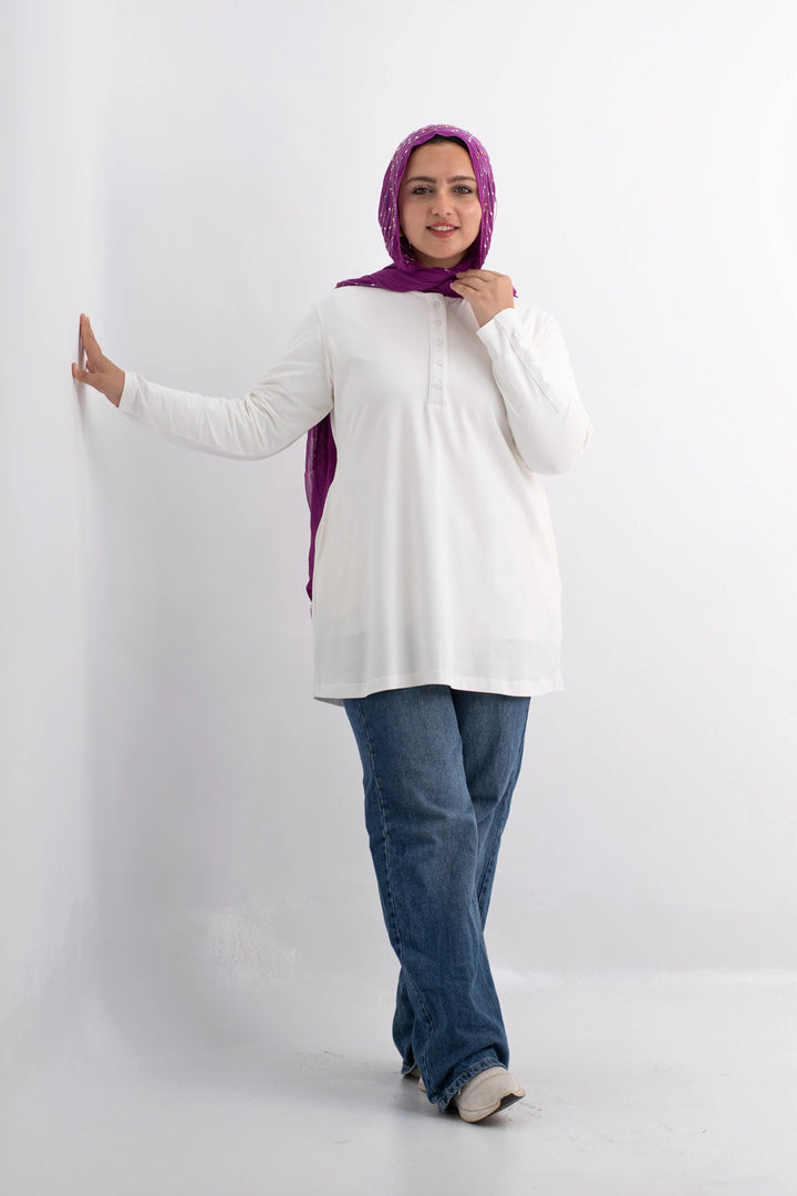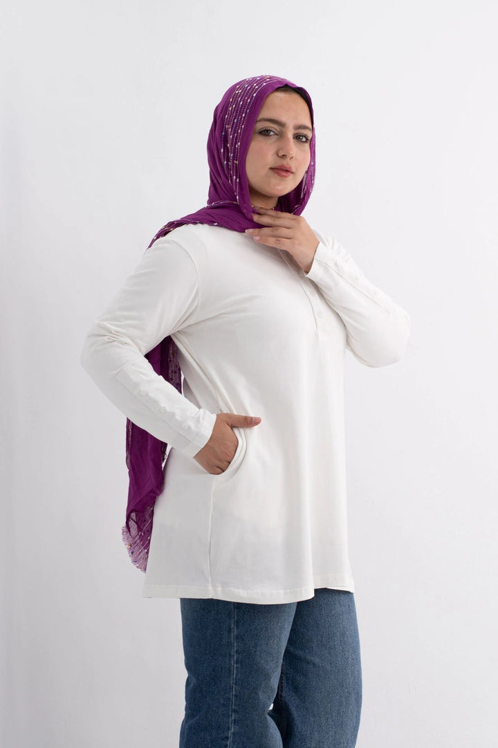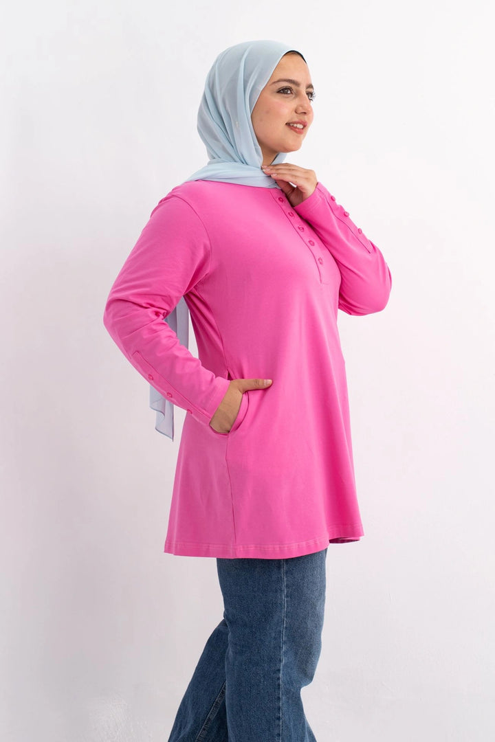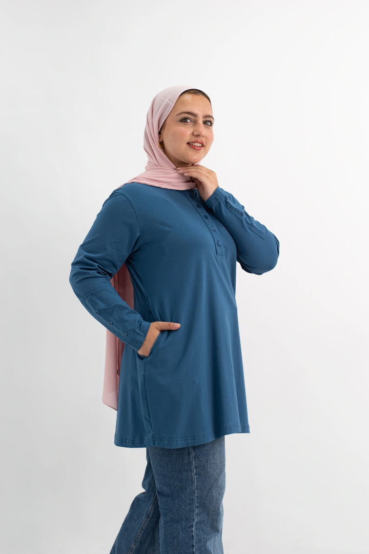 تي شيرت 100% قطن برقبه دائريه وزراير وفي جايبين علي الجوانب وفي نهايه الكم زراير لإضفاء لمسه جماليه