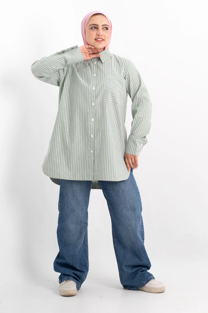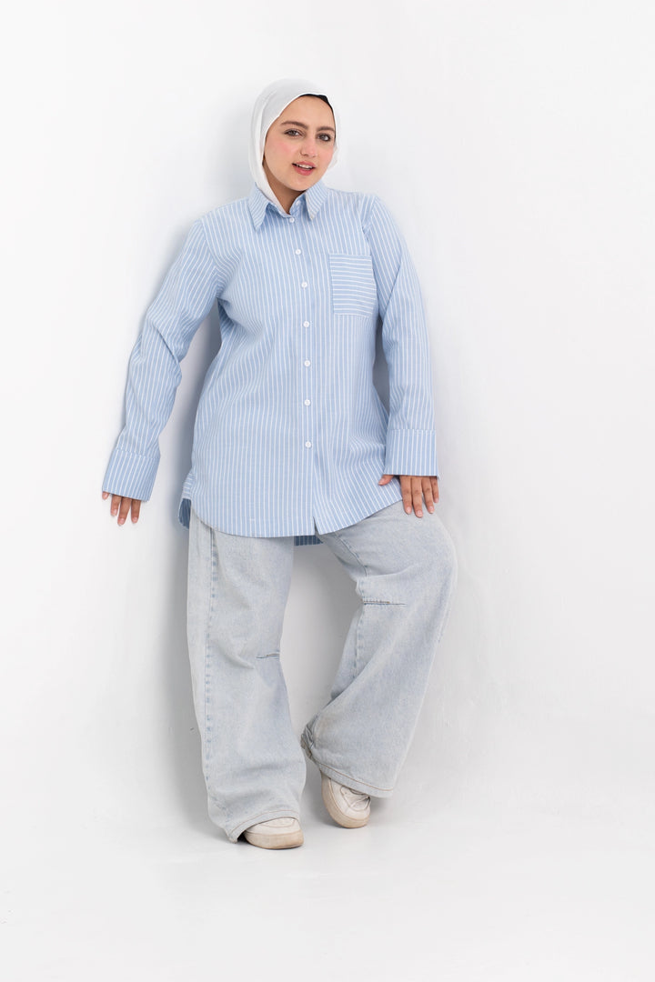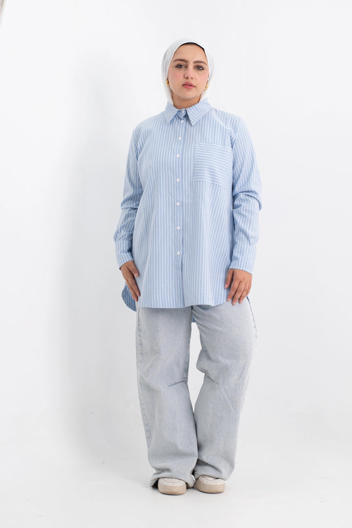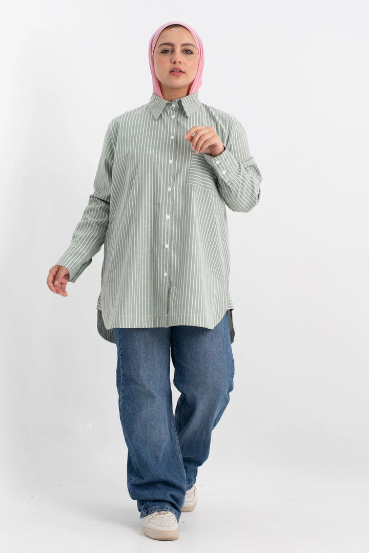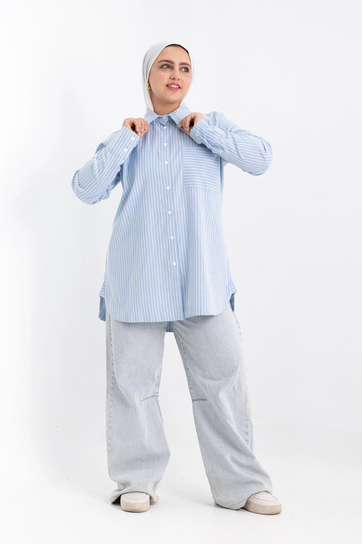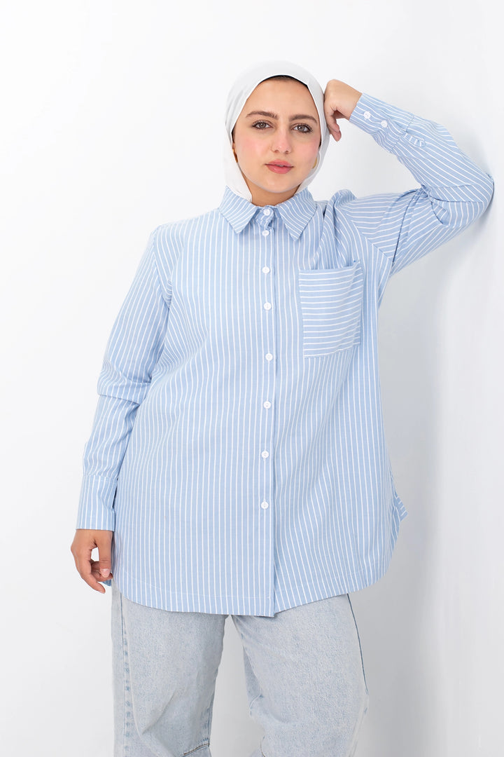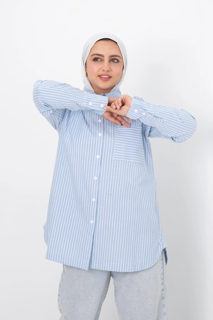 شميز مقلم بزراير وبه جيب واسوره عريضه في الكم ونهايته ديزاين مميز بخياطه عريضه ودوران
