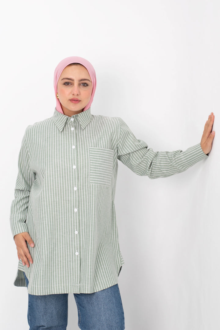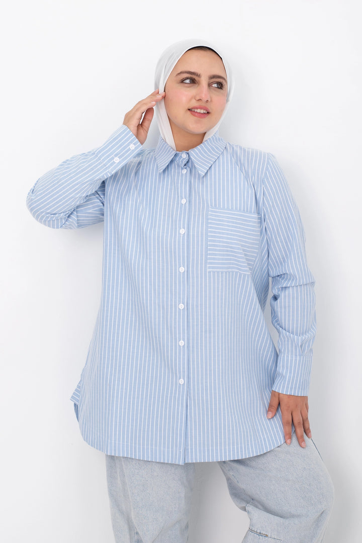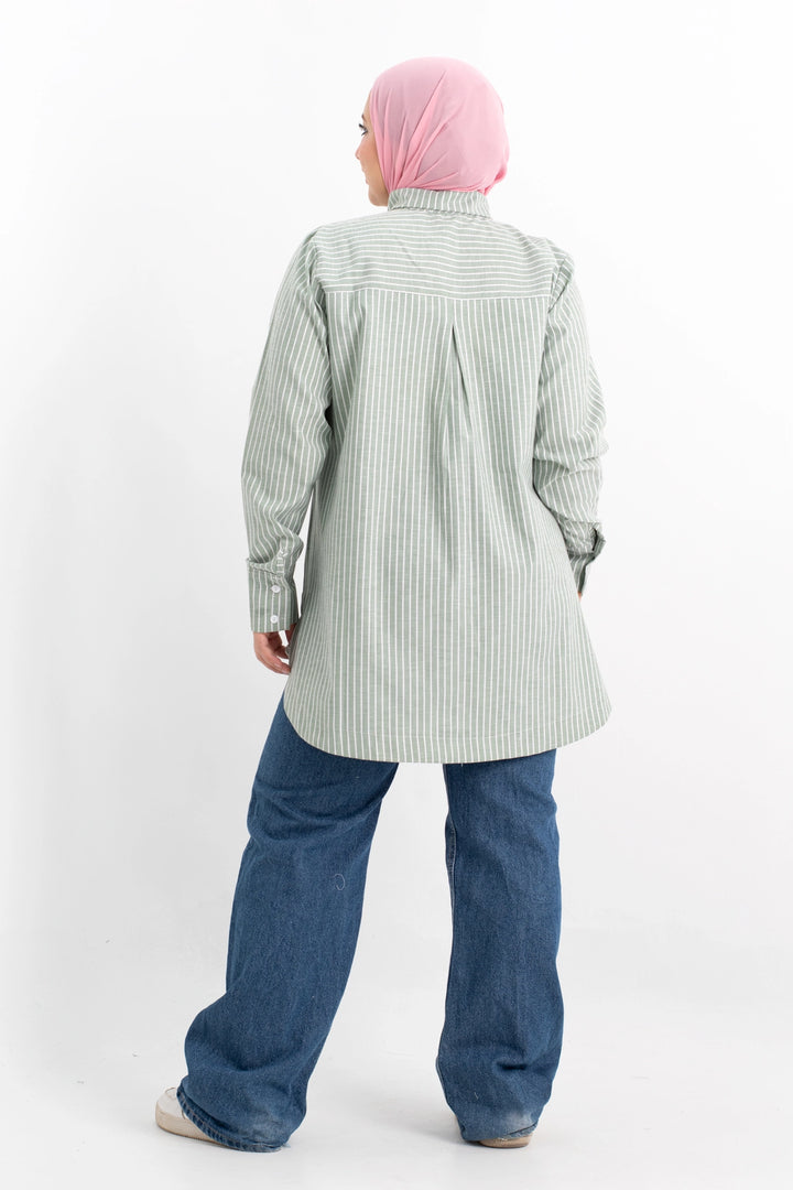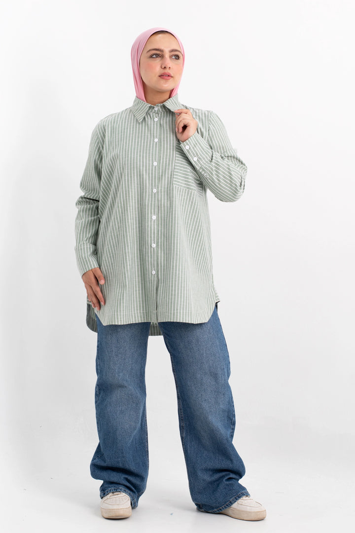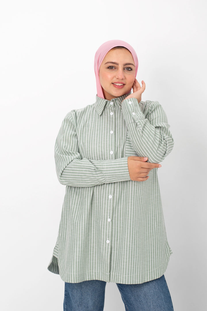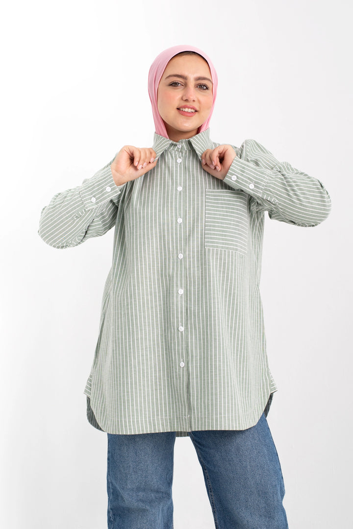 شميز مقلم بزراير وبه جيب واسوره عريضه في الكم ونهايته ديزاين مميز بخياطه عريضه ودوران