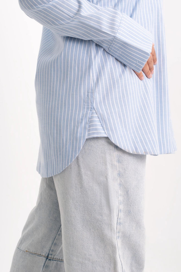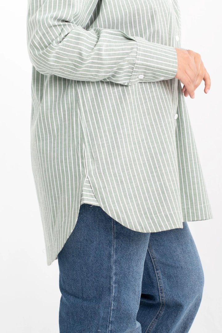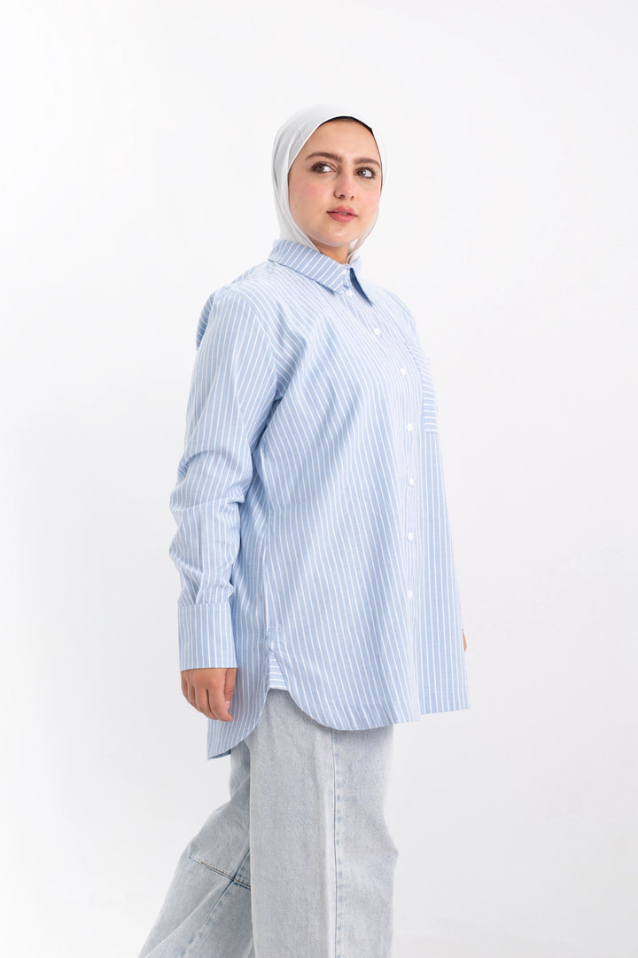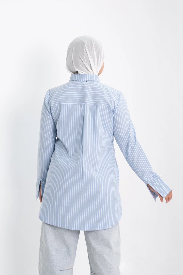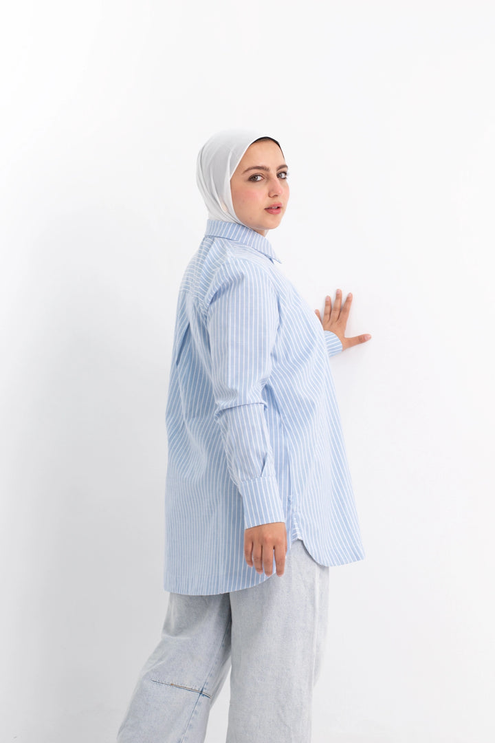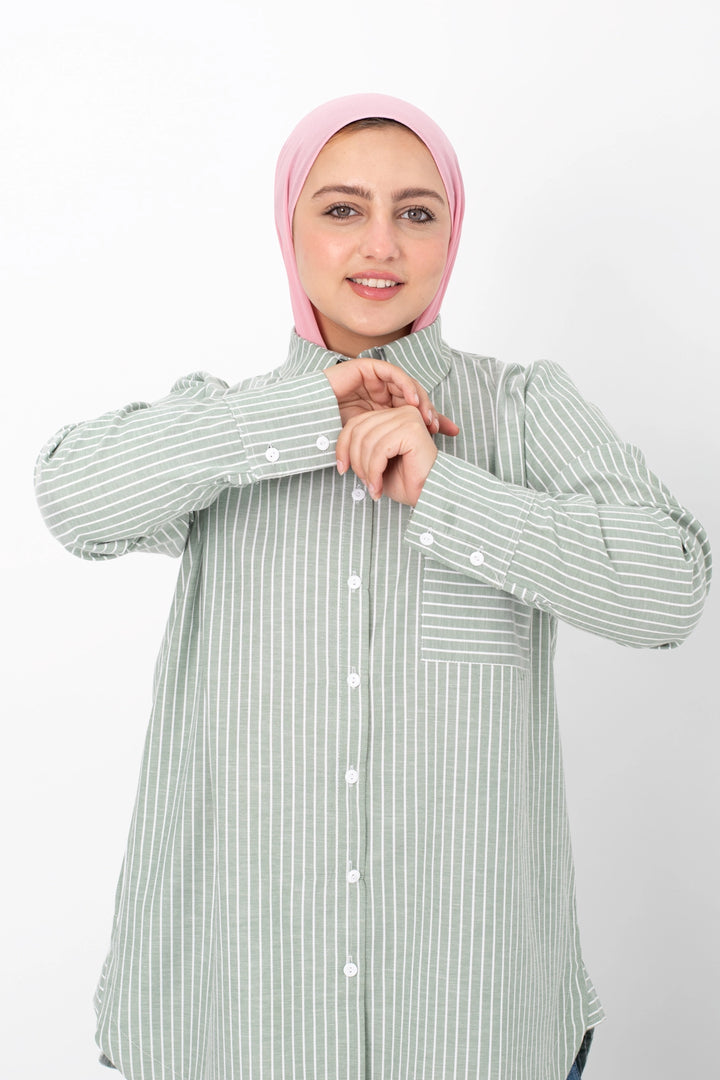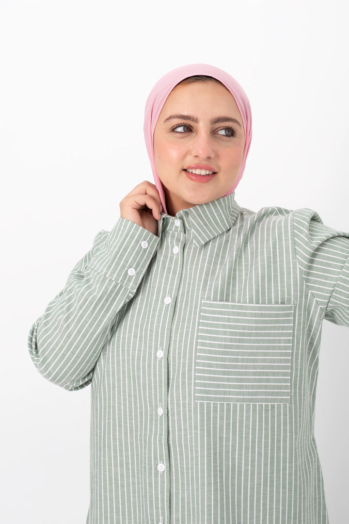 شميز مقلم بزراير وبه جيب واسوره عريضه في الكم ونهايته ديزاين مميز بخياطه عريضه ودوران