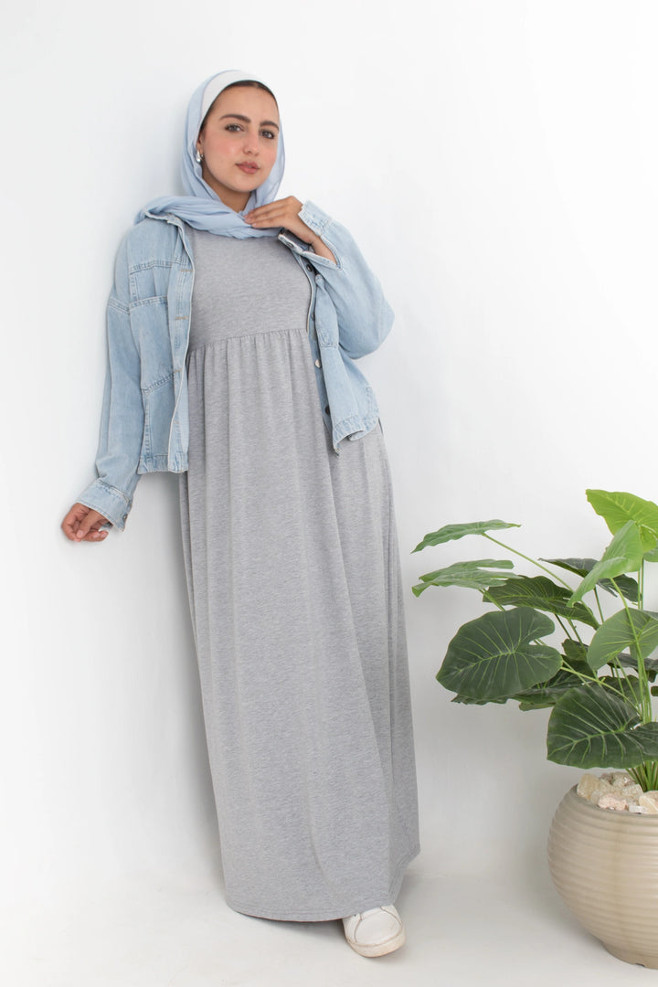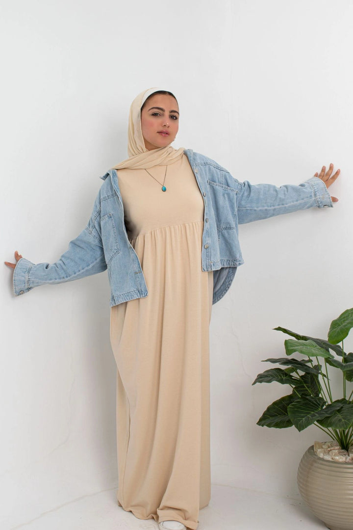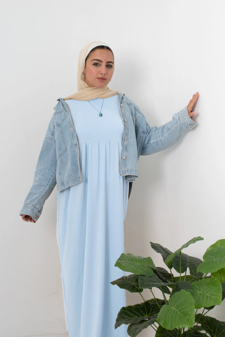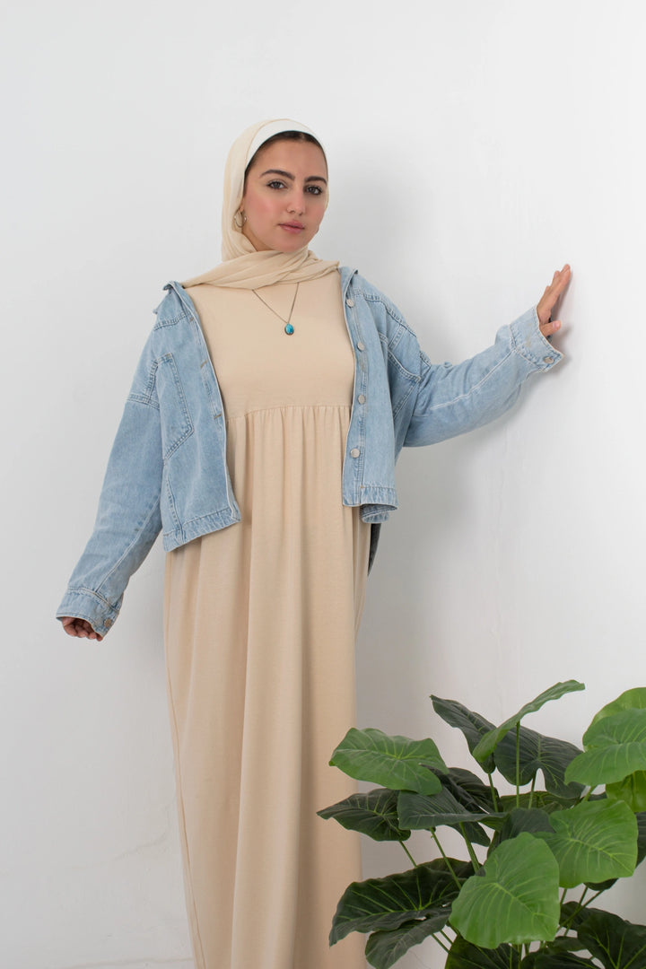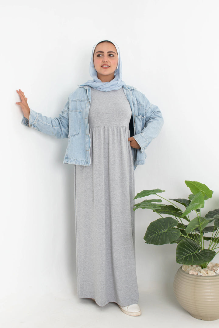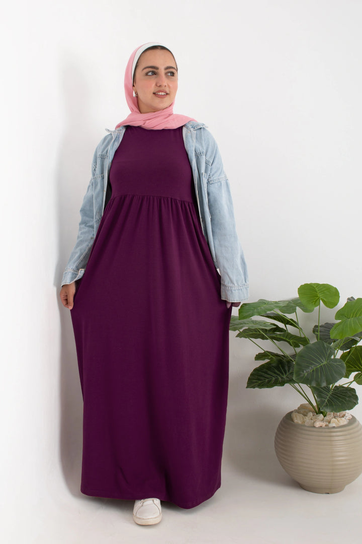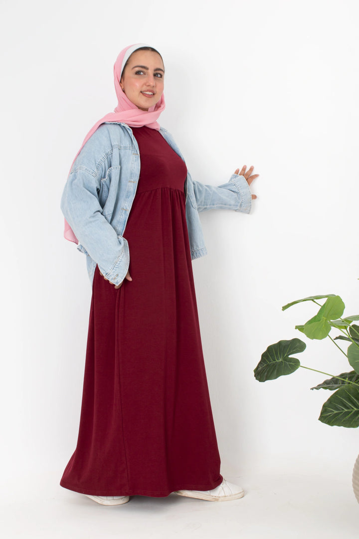 فستان طبقات 65% قطن 35% ليكرا كم طويل في نهاية الكم استيك. قصة واسعة غير ملاصق للجسم.