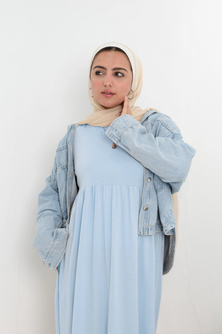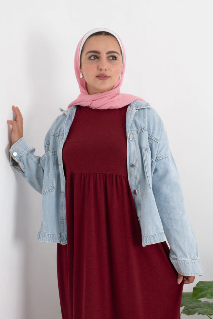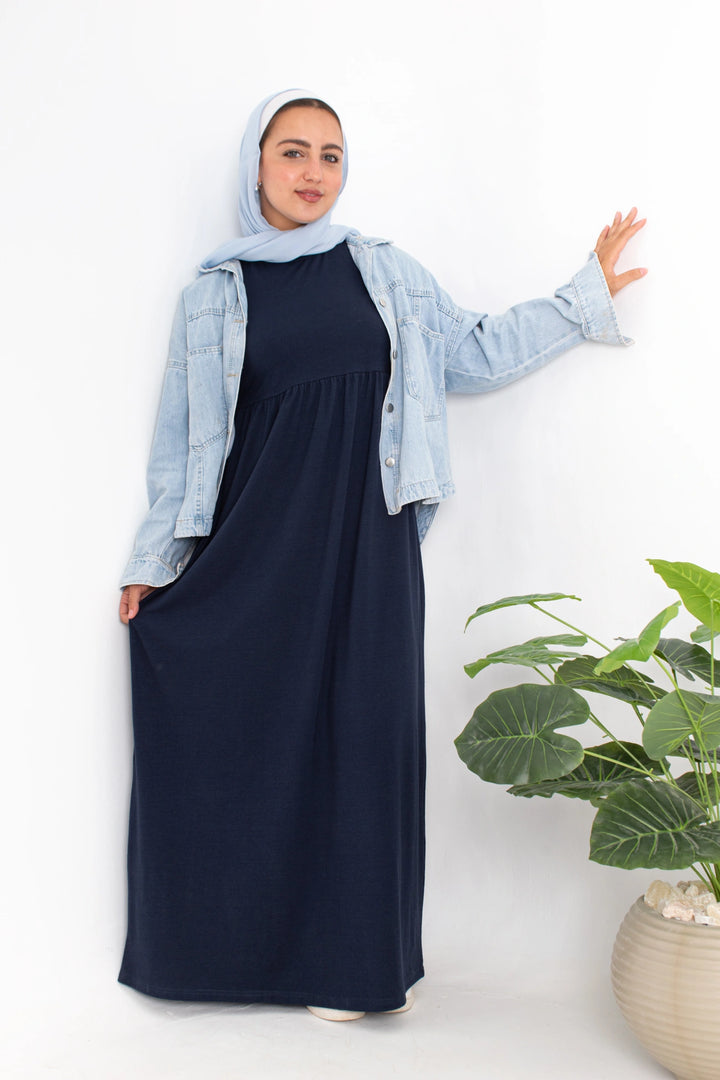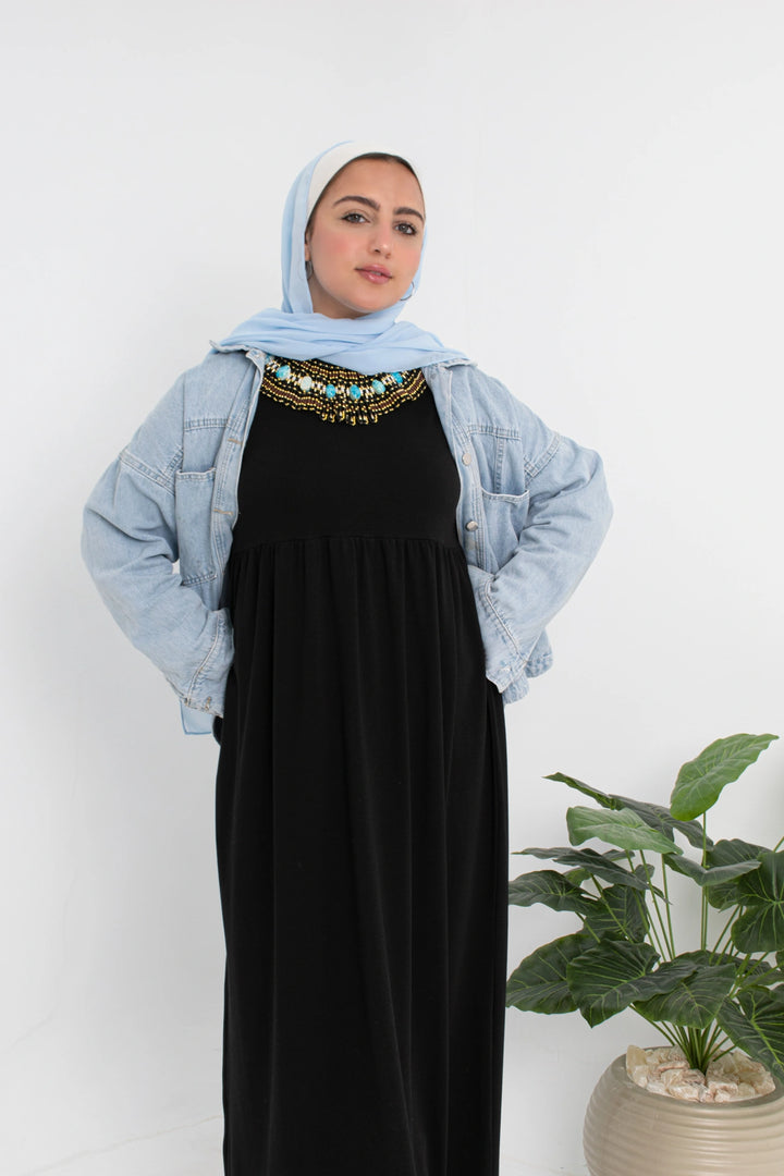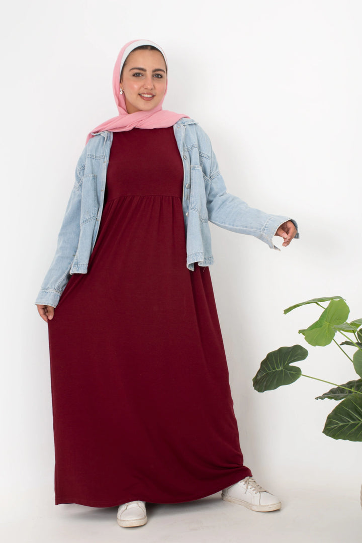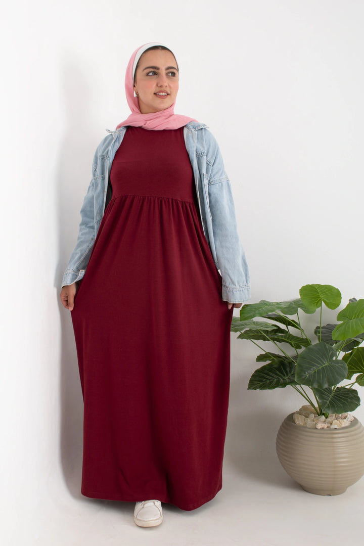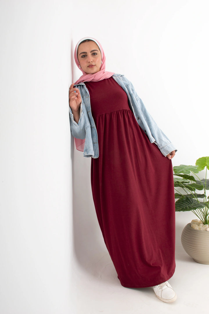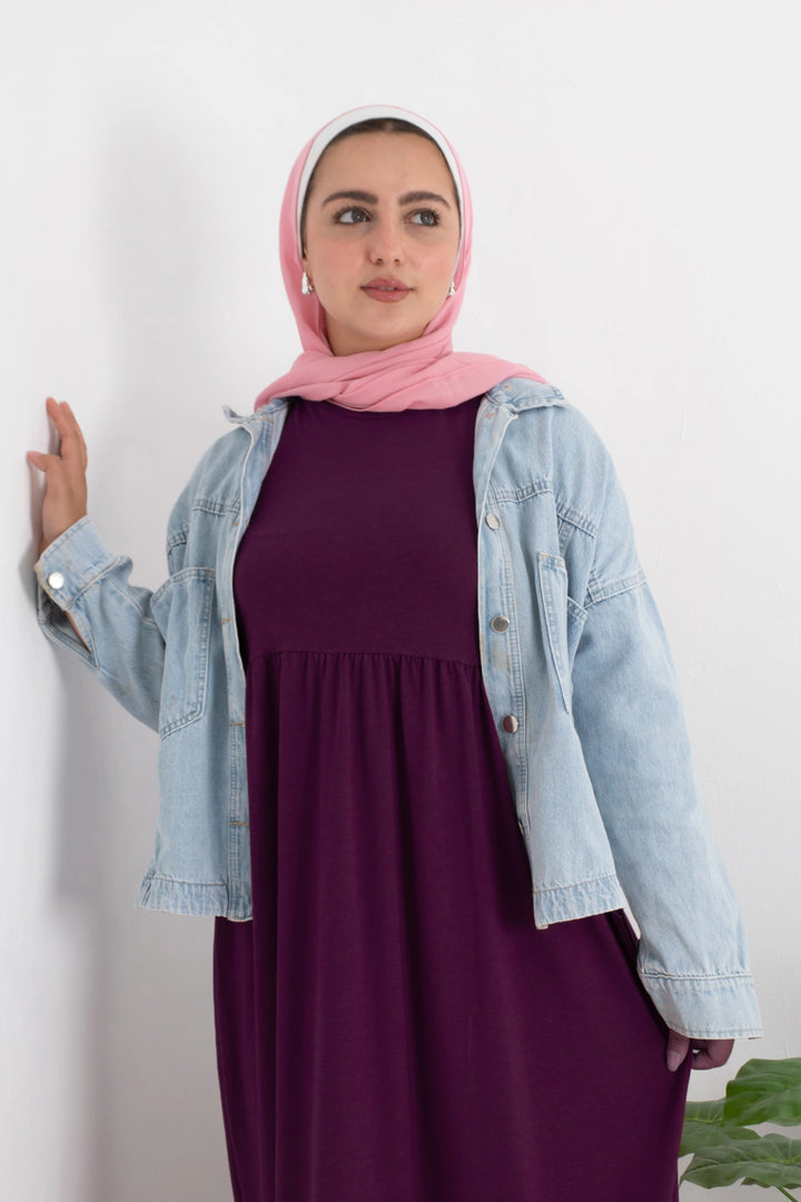 فستان طبقات 65% قطن 35% ليكرا كم طويل في نهاية الكم استيك. قصة واسعة غير ملاصق للجسم.