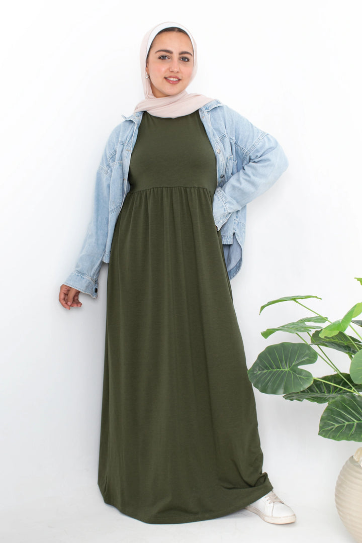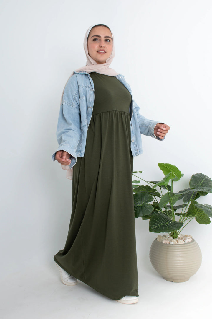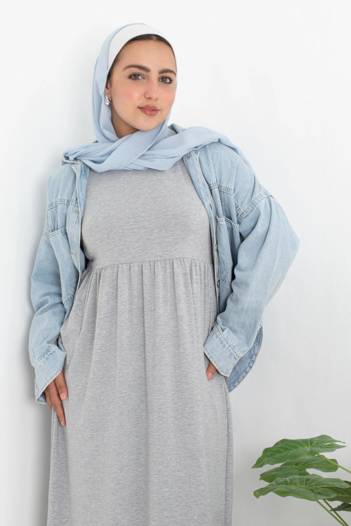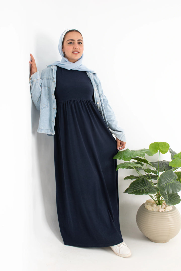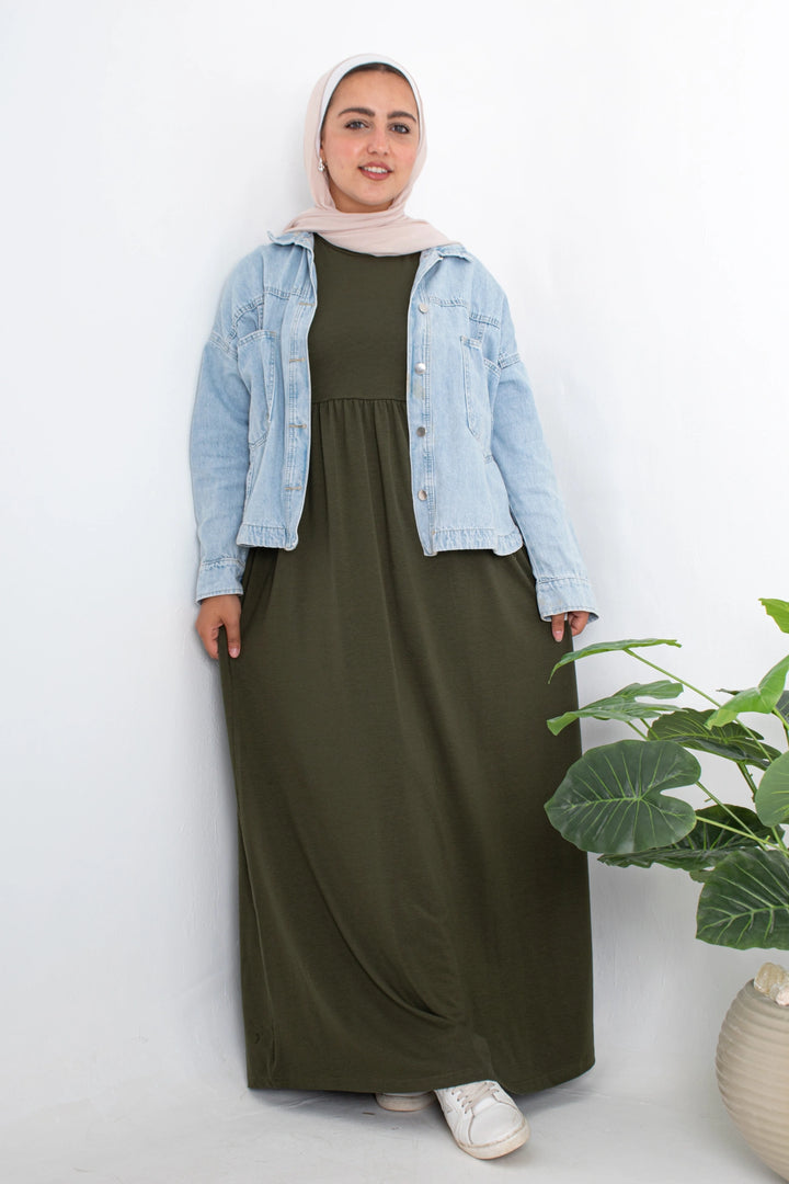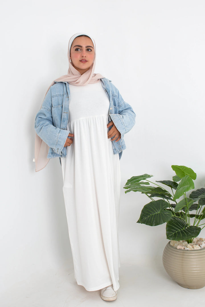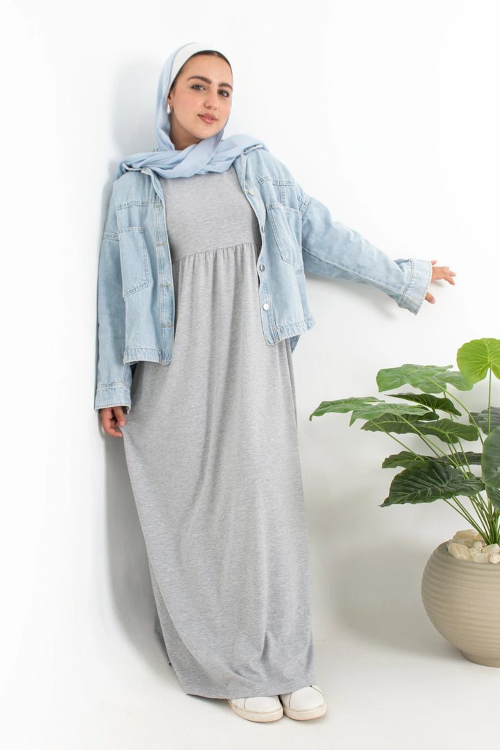 فستان طبقات 65% قطن 35% ليكرا كم طويل في نهاية الكم استيك. قصة واسعة غير ملاصق للجسم.