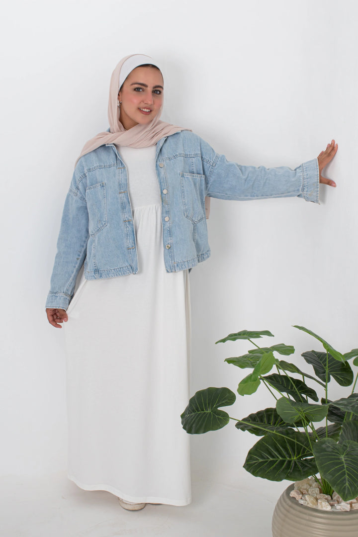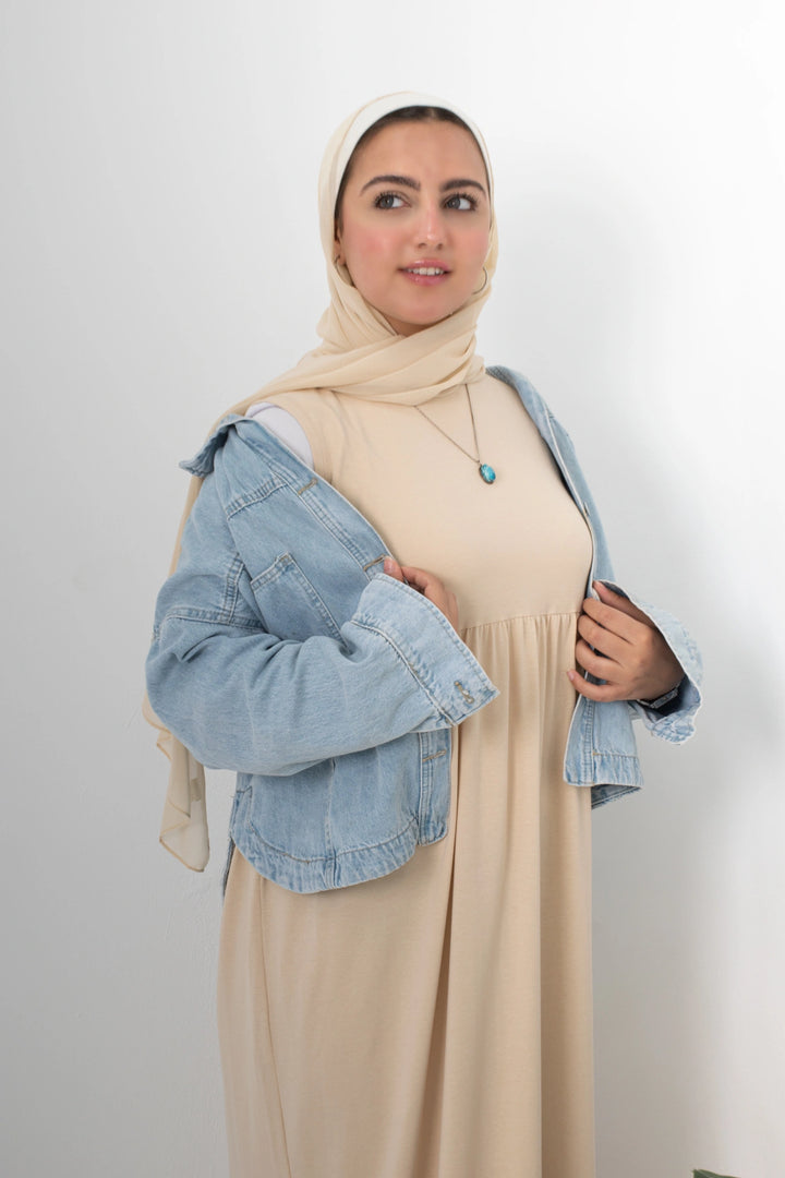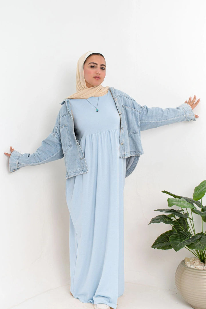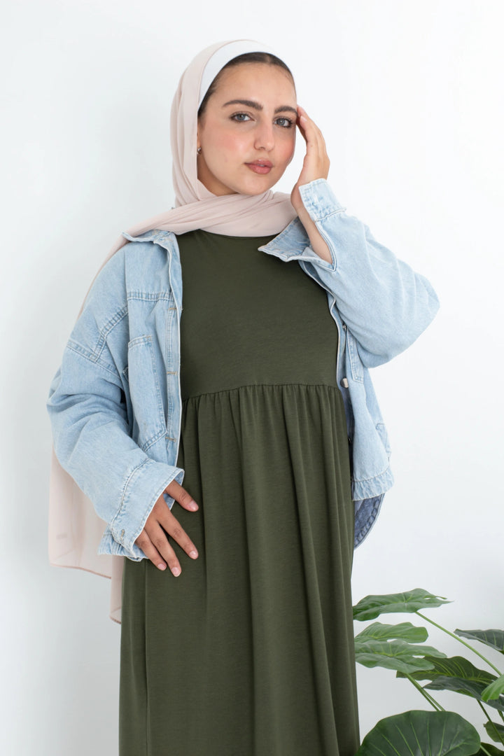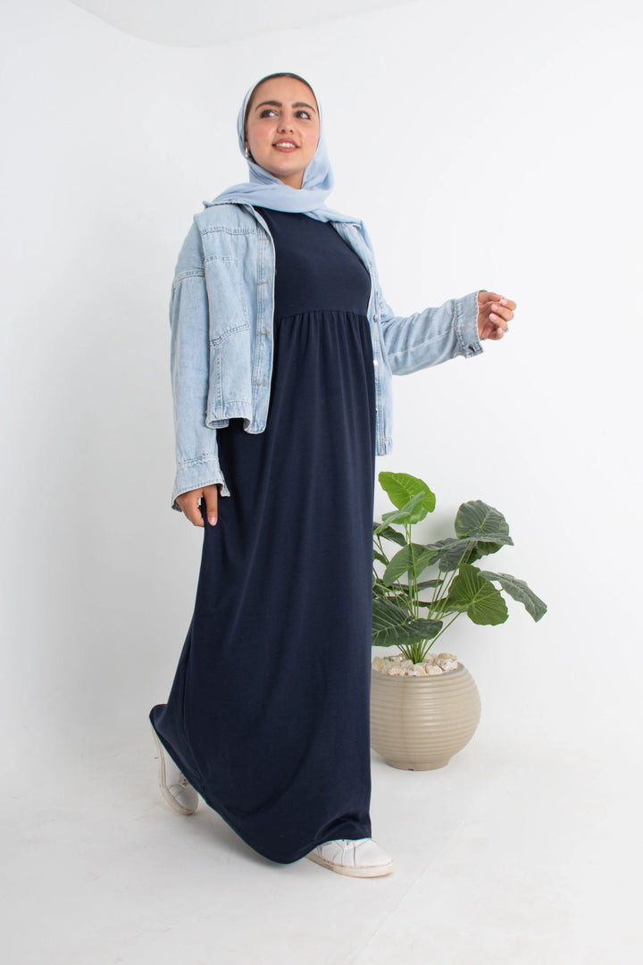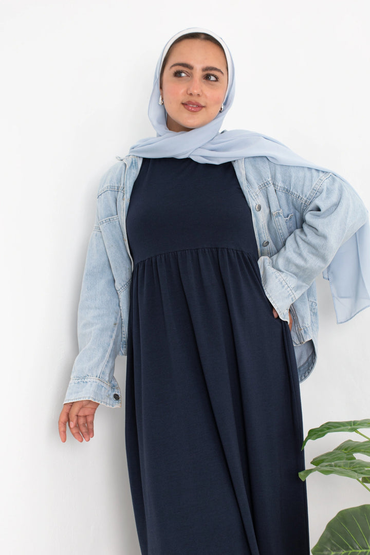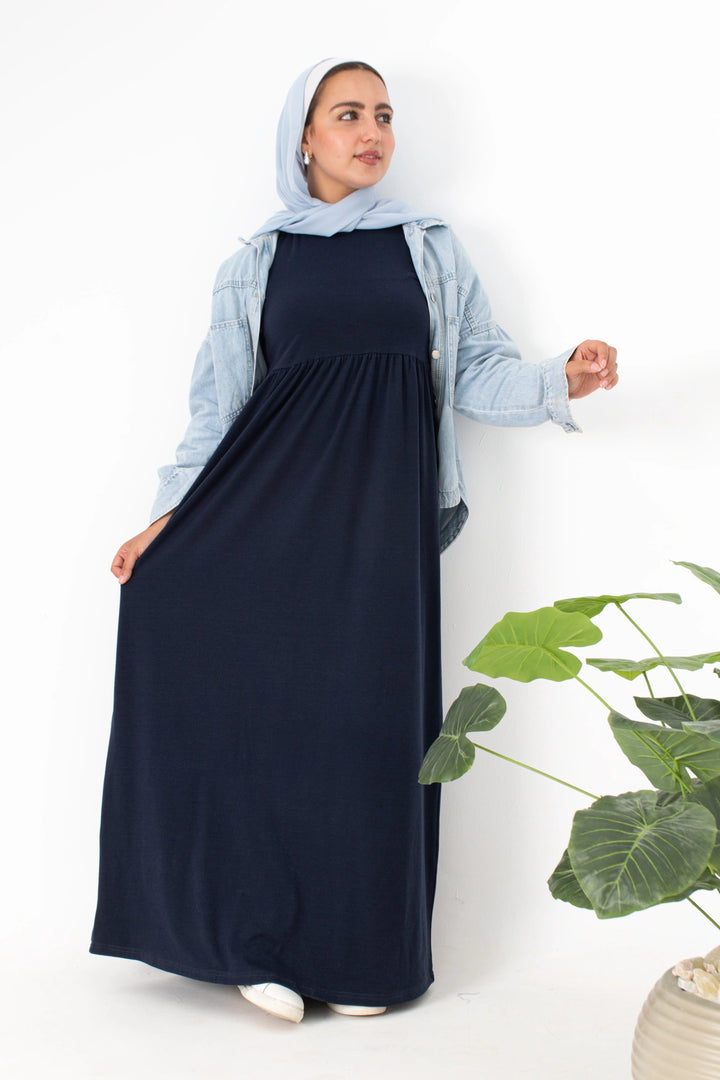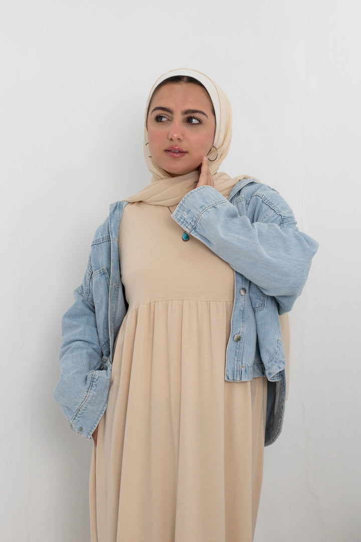 فستان طبقات 65% قطن 35% ليكرا كم طويل في نهاية الكم استيك. قصة واسعة غير ملاصق للجسم.