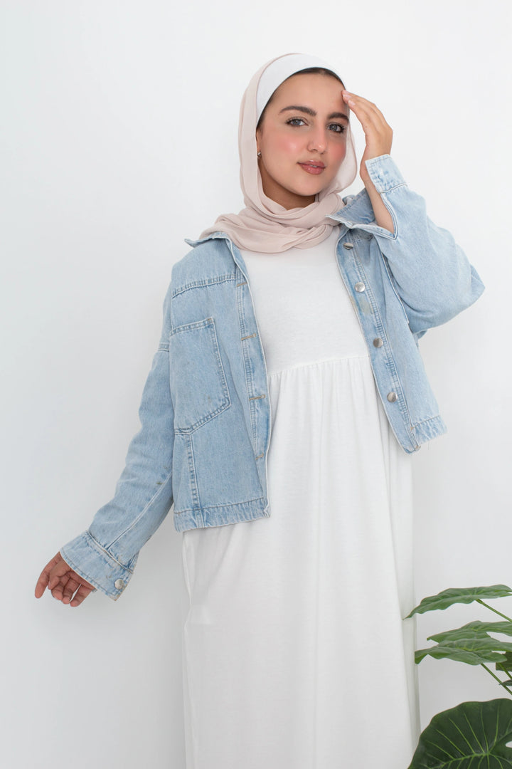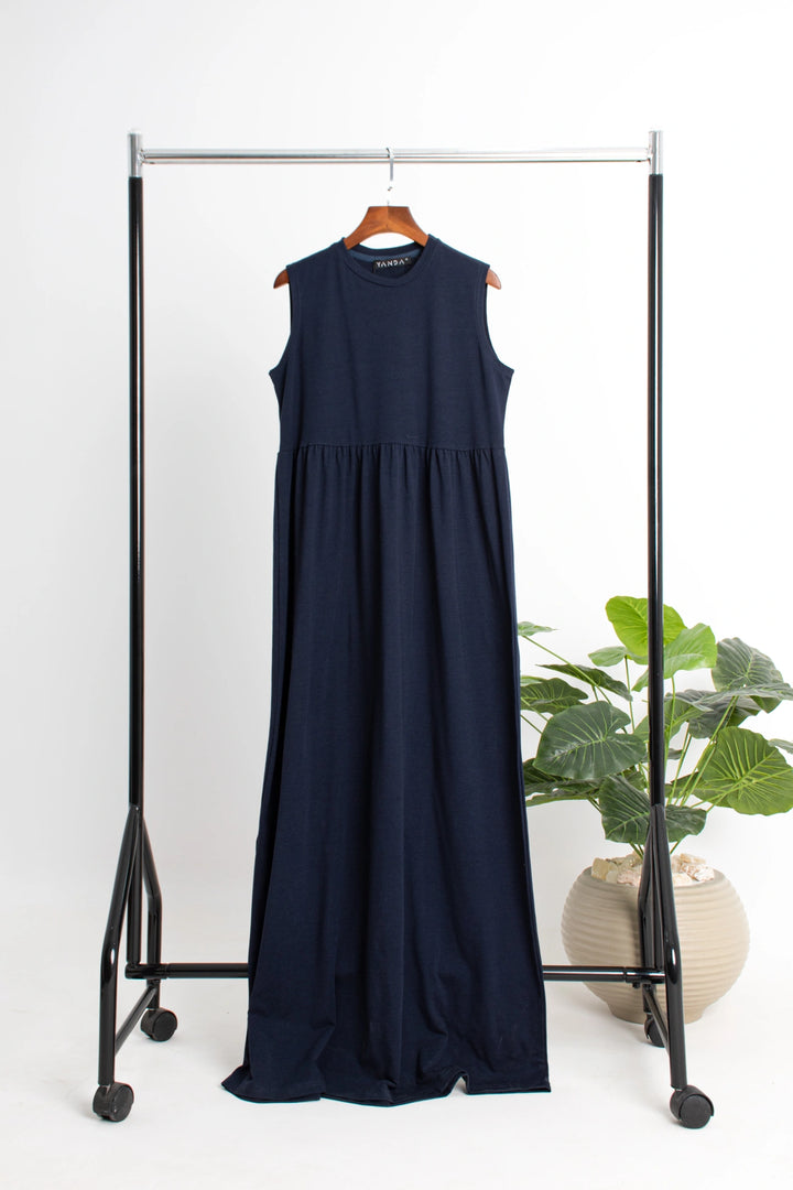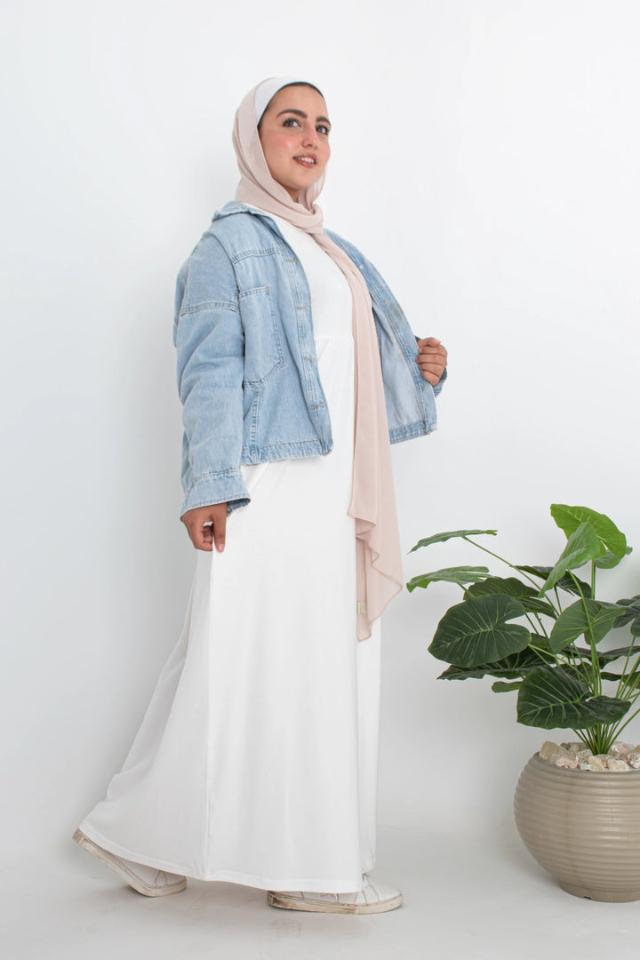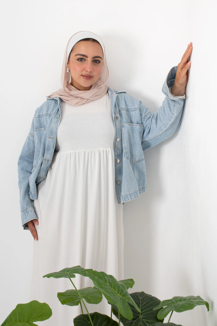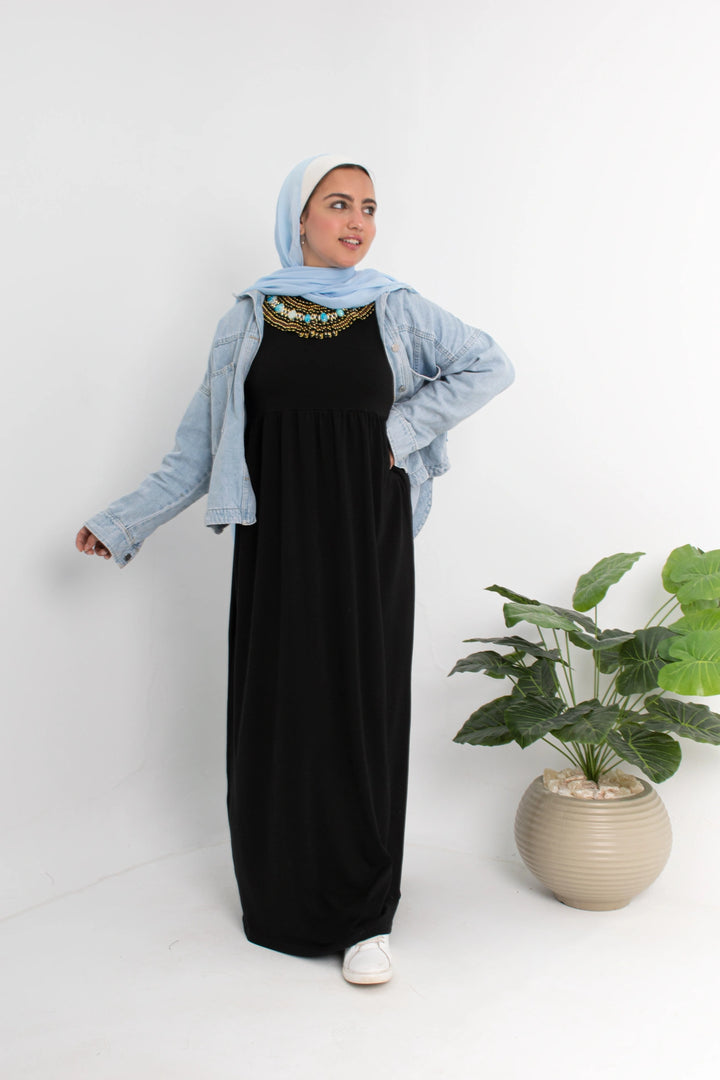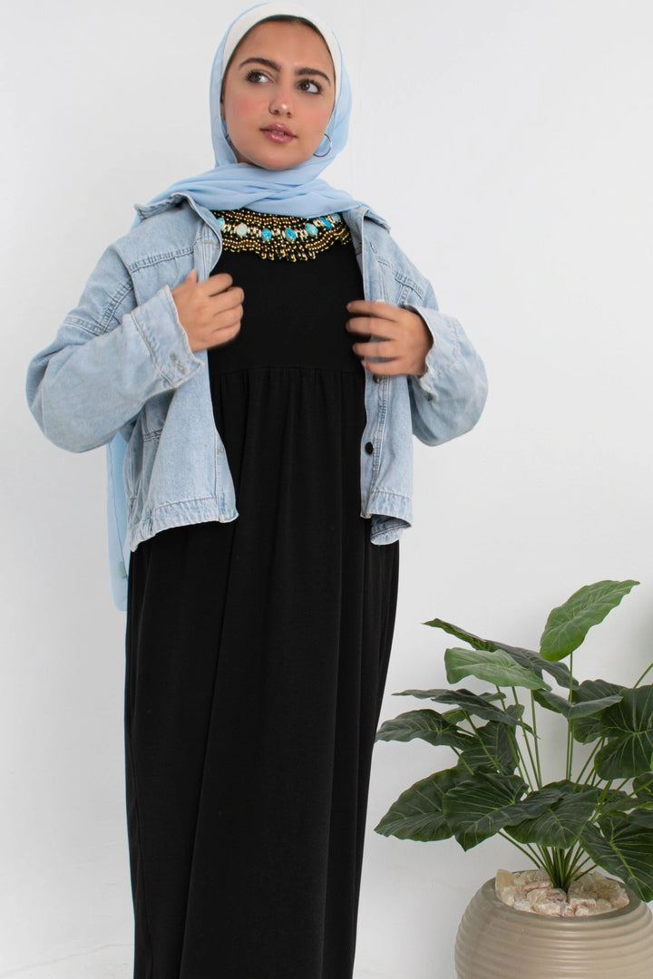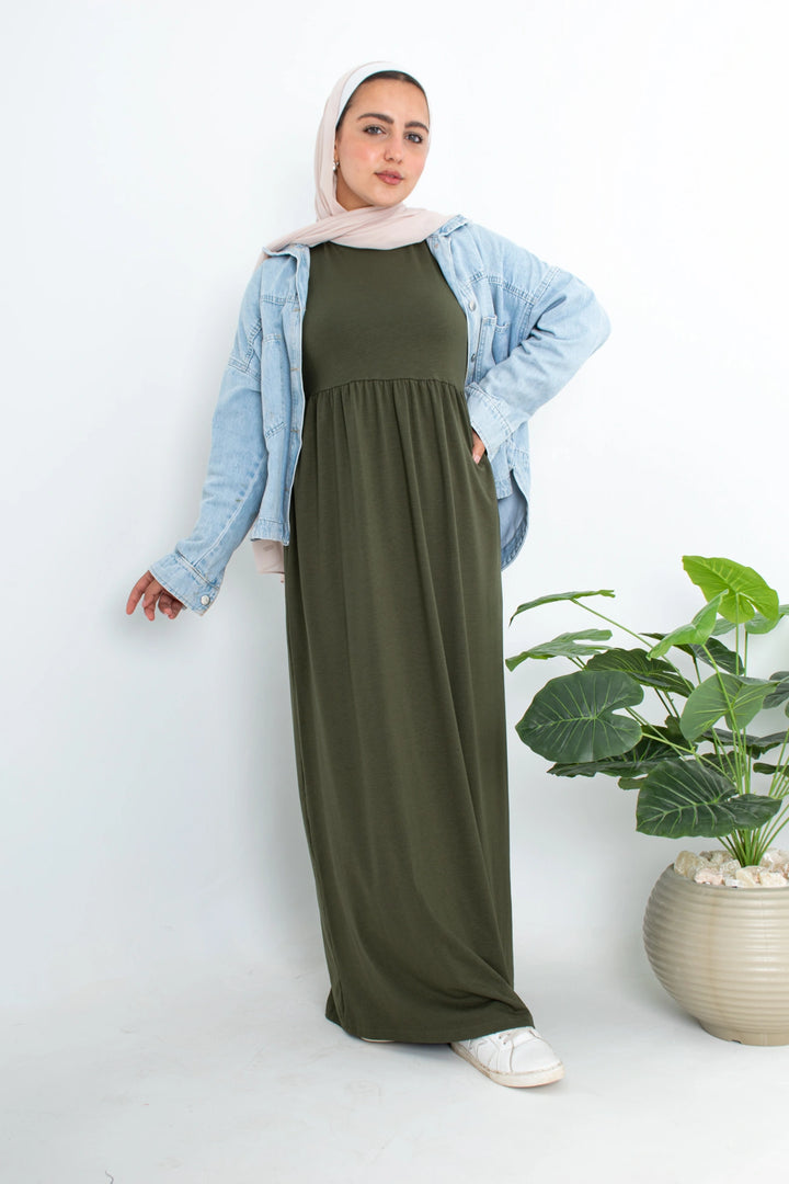 فستان طبقات 65% قطن 35% ليكرا كم طويل في نهاية الكم استيك. قصة واسعة غير ملاصق للجسم.