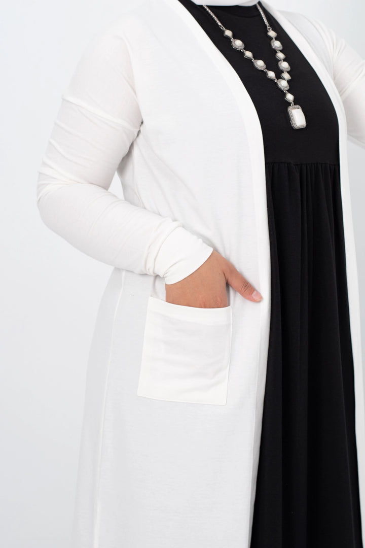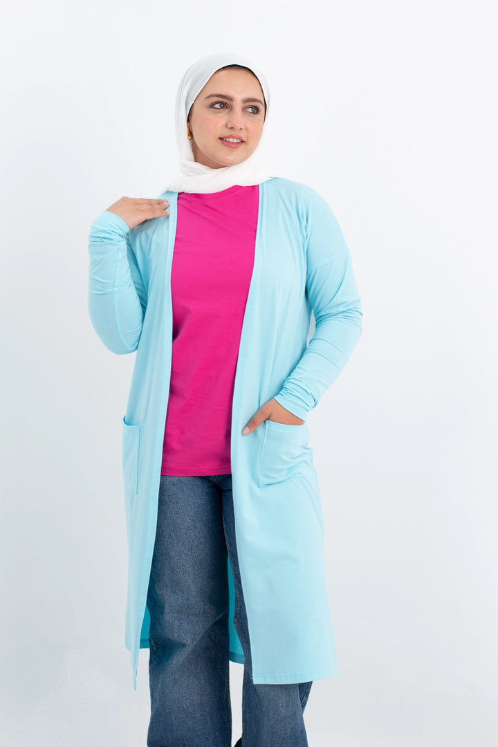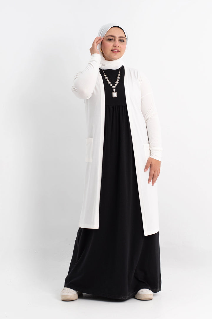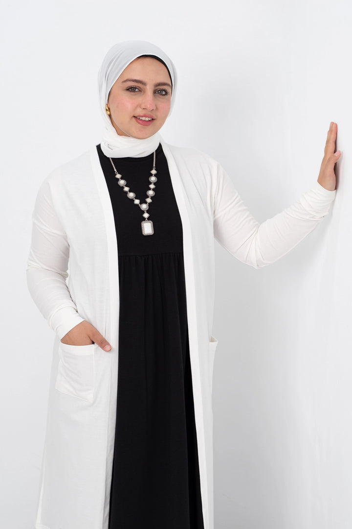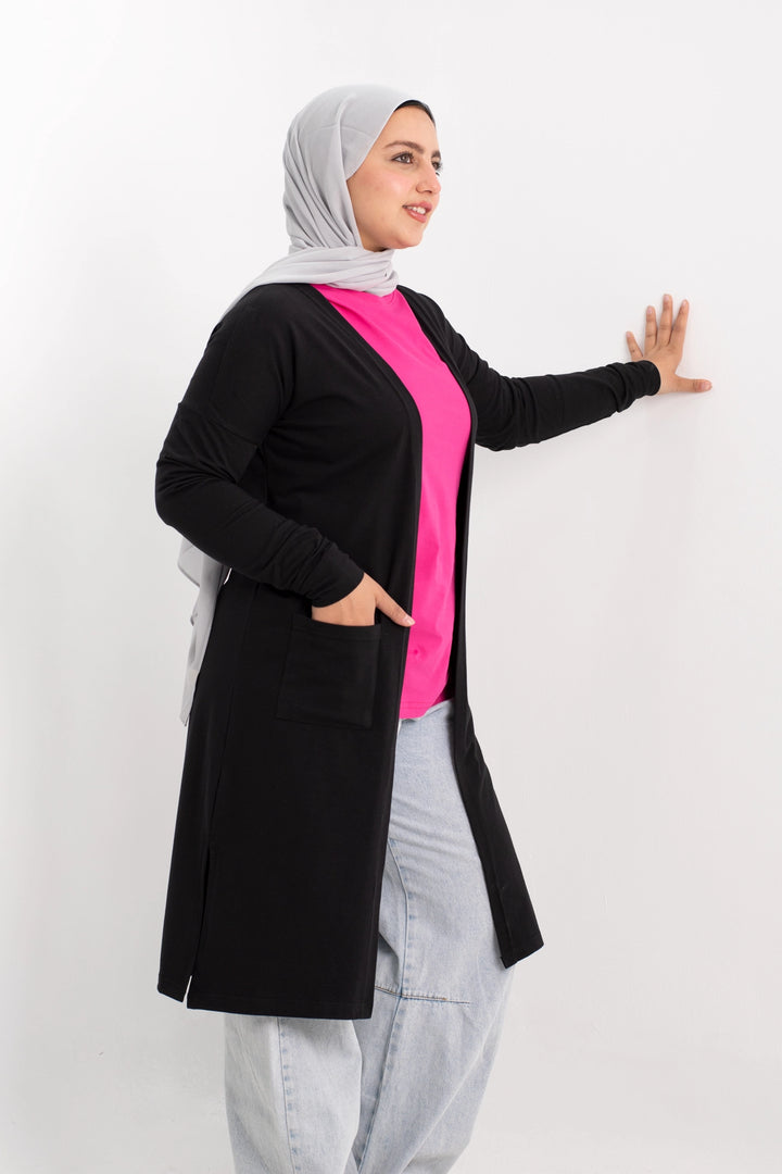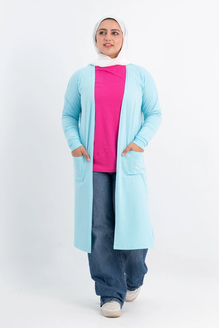 كاردجان طويل قطن كم طويل في نهايته اسوره وفي فاتحتين علي الجوانب وبه جايبين خامته قطن به نسبه ليكرا خفيفه
