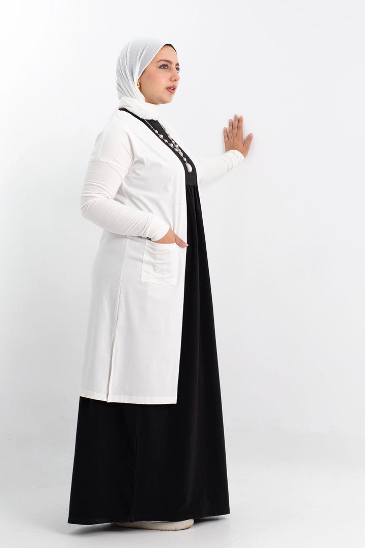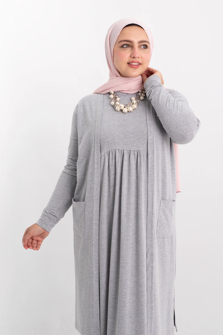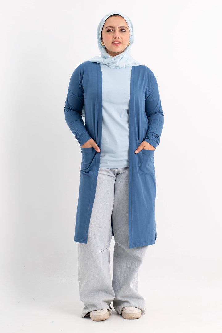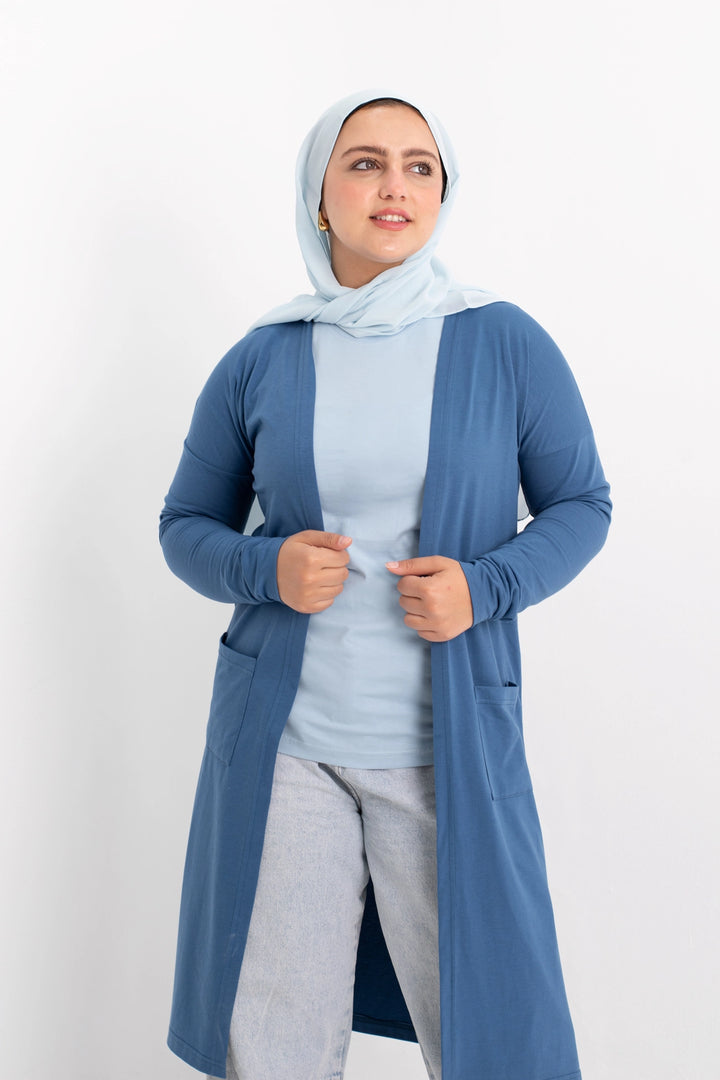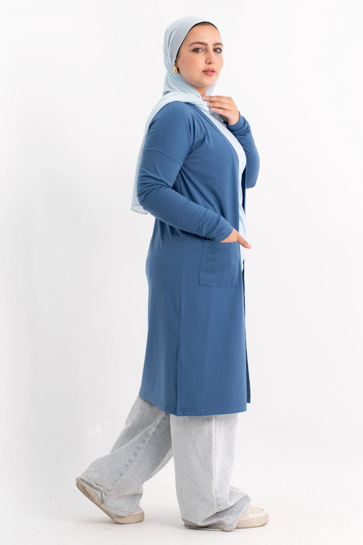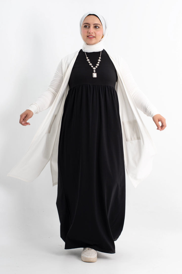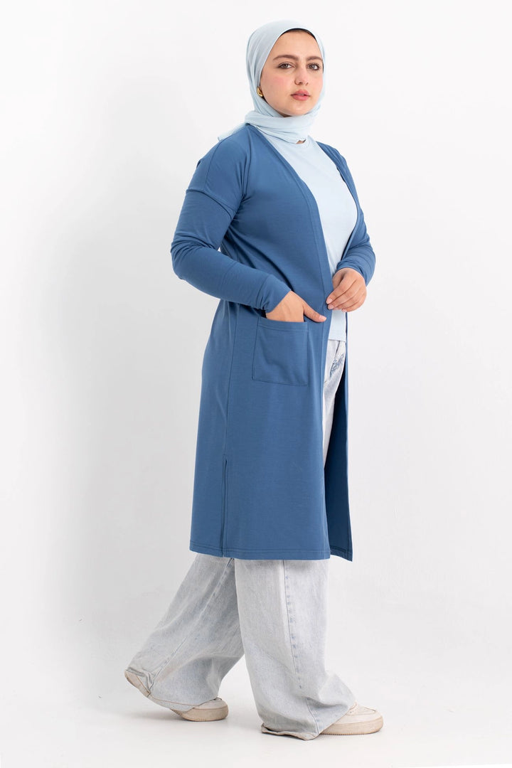 كاردجان طويل قطن كم طويل في نهايته اسوره وفي فاتحتين علي الجوانب وبه جايبين خامته قطن به نسبه ليكرا خفيفه