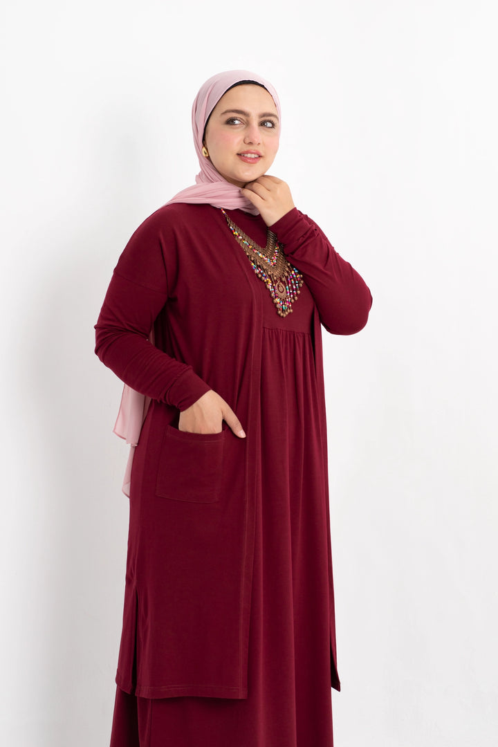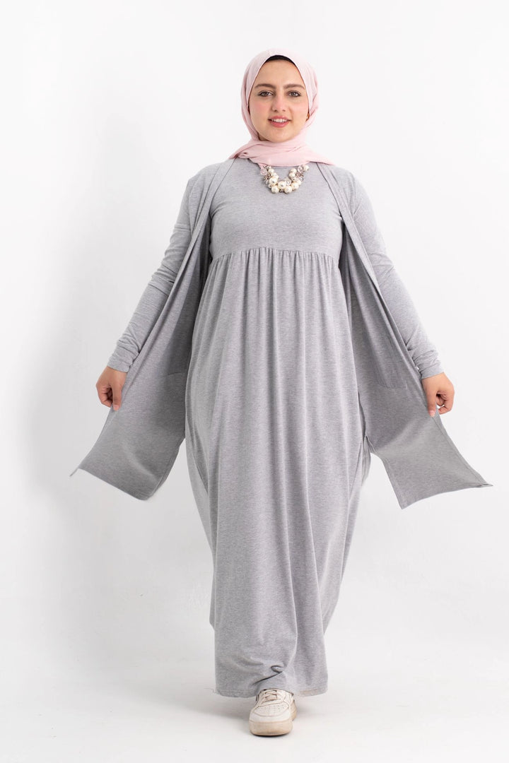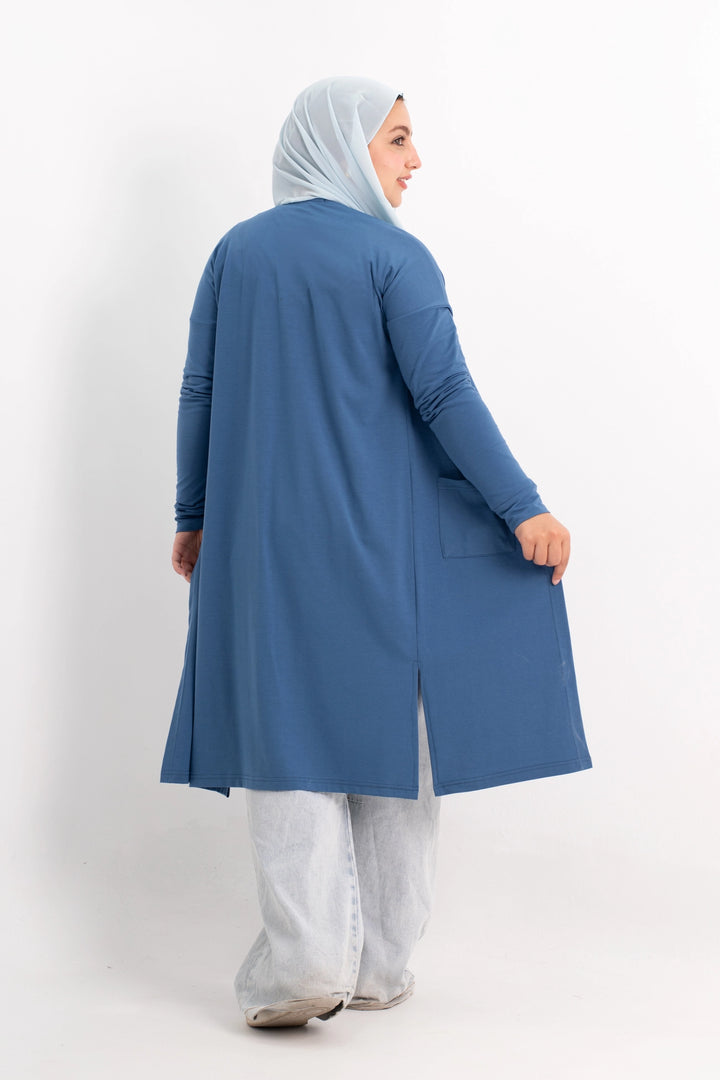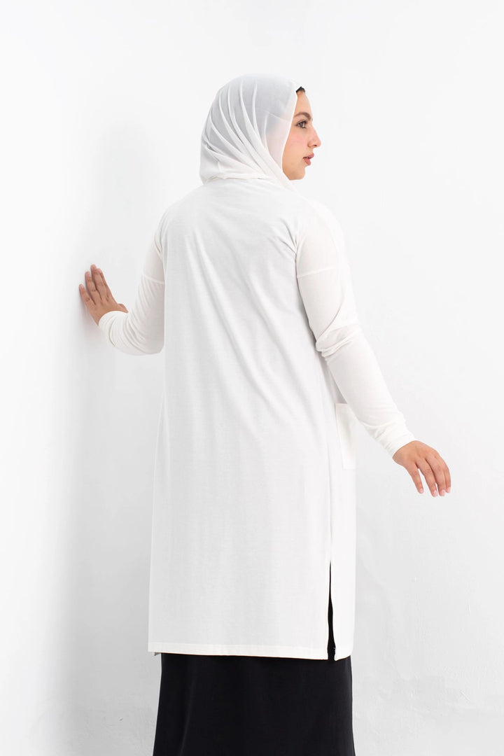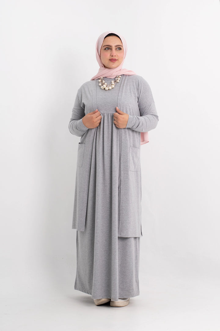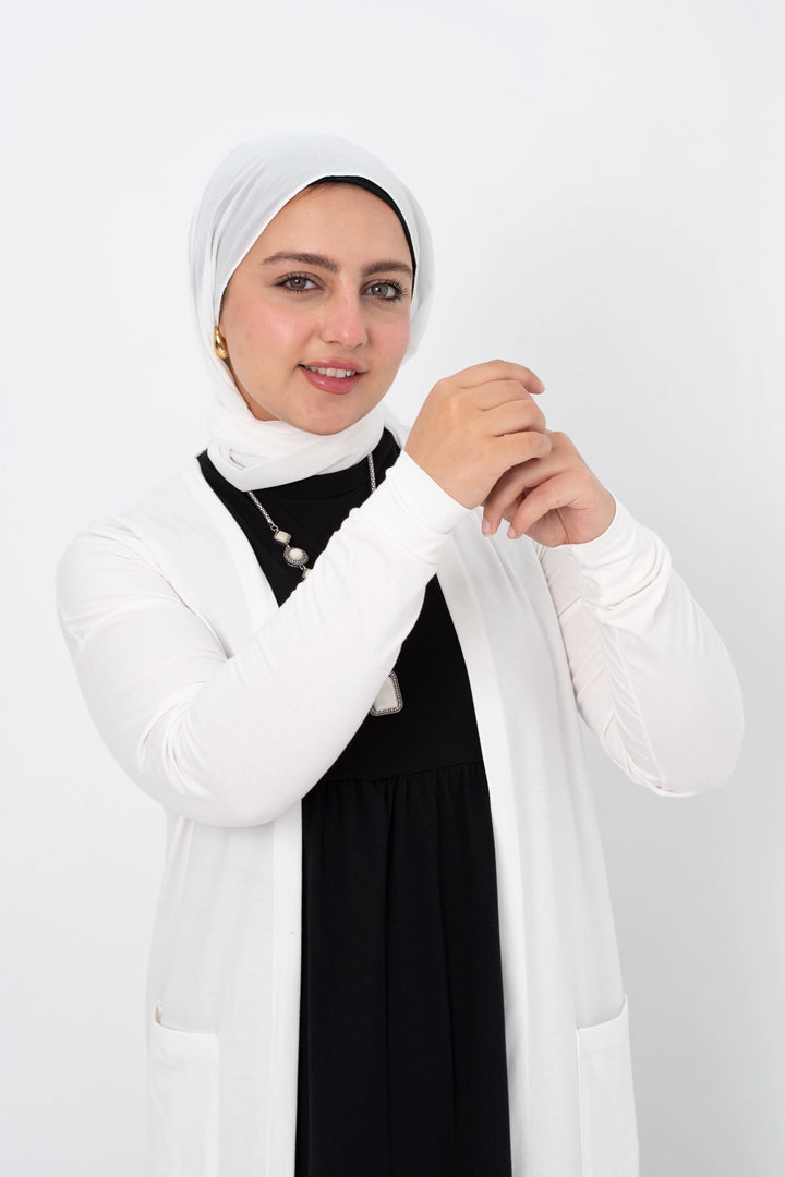كاردجان طويل قطن كم طويل في نهايته اسوره وفي فاتحتين علي الجوانب وبه جايبين خامته قطن به نسبه ليكرا خفيفه