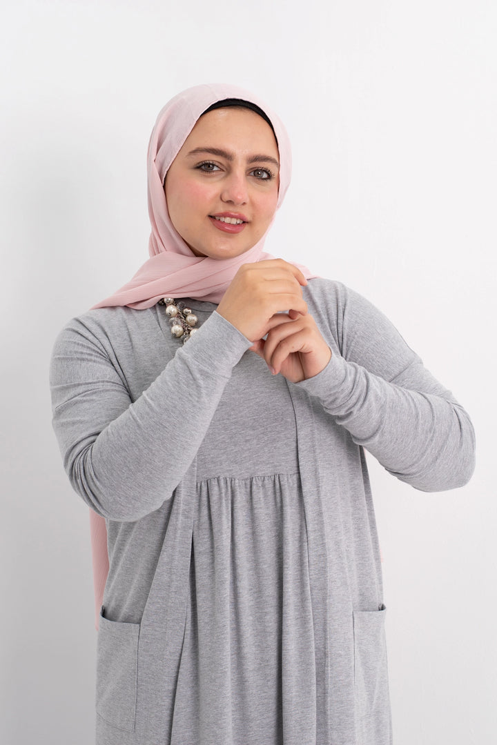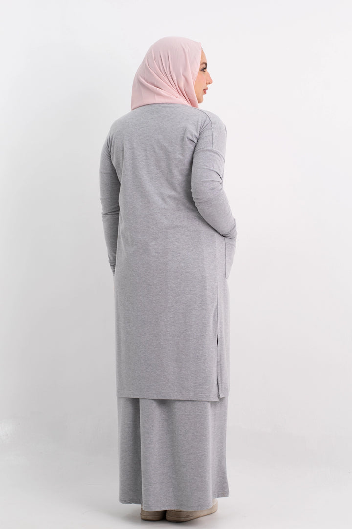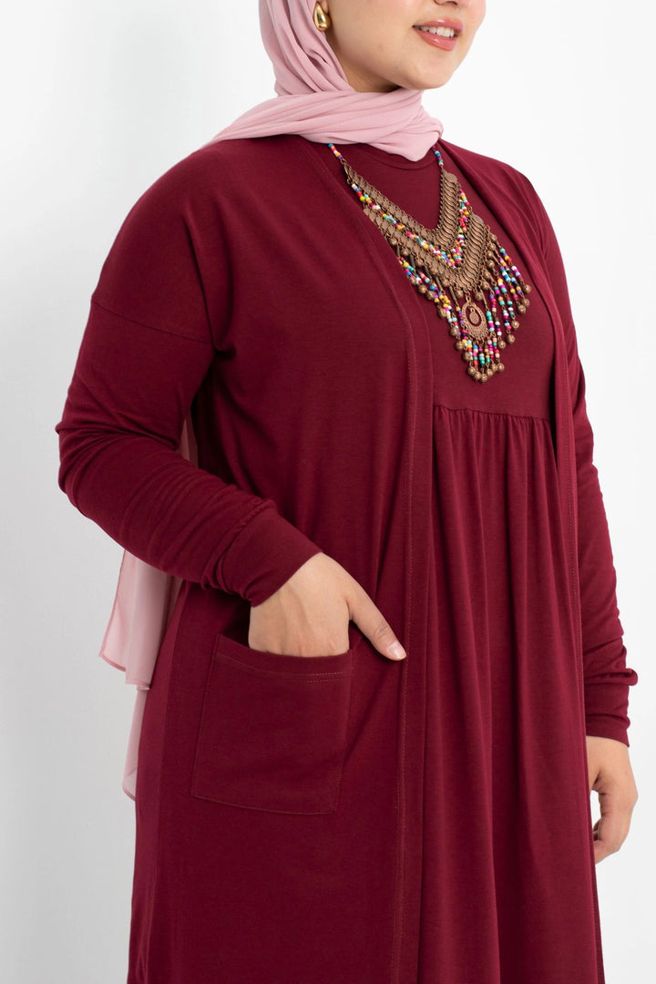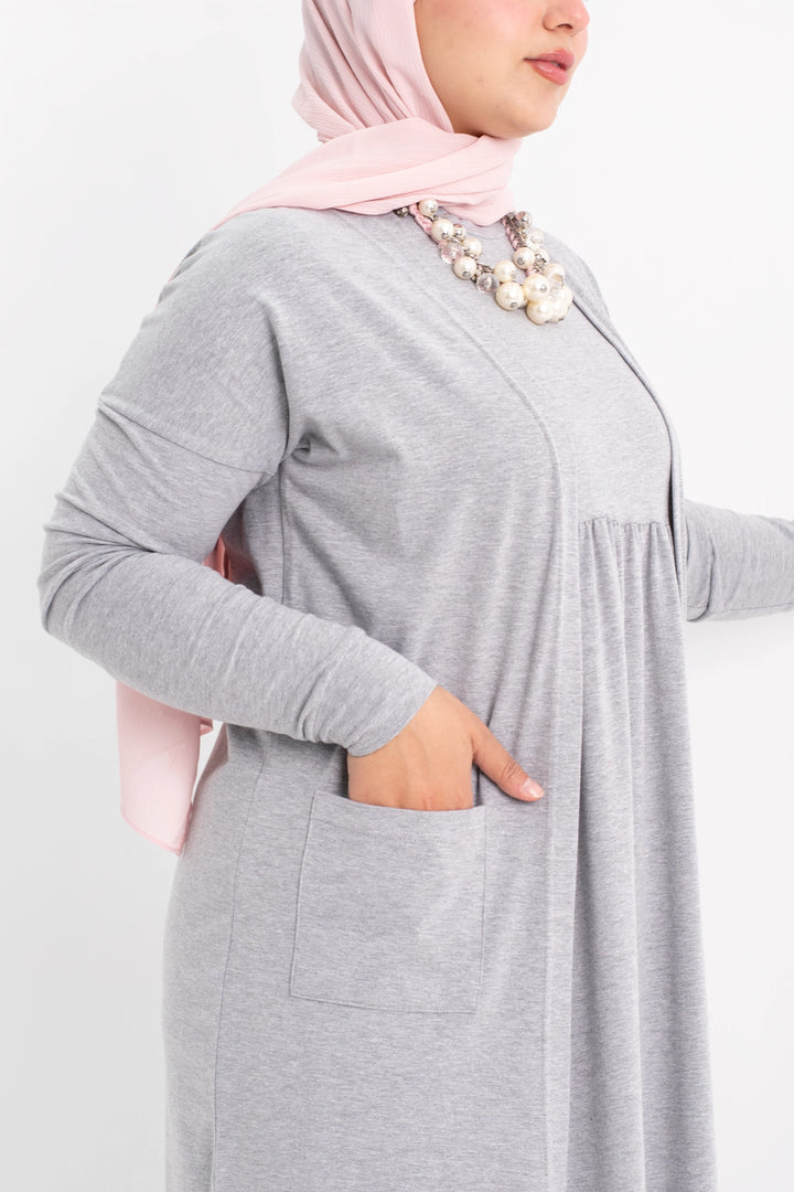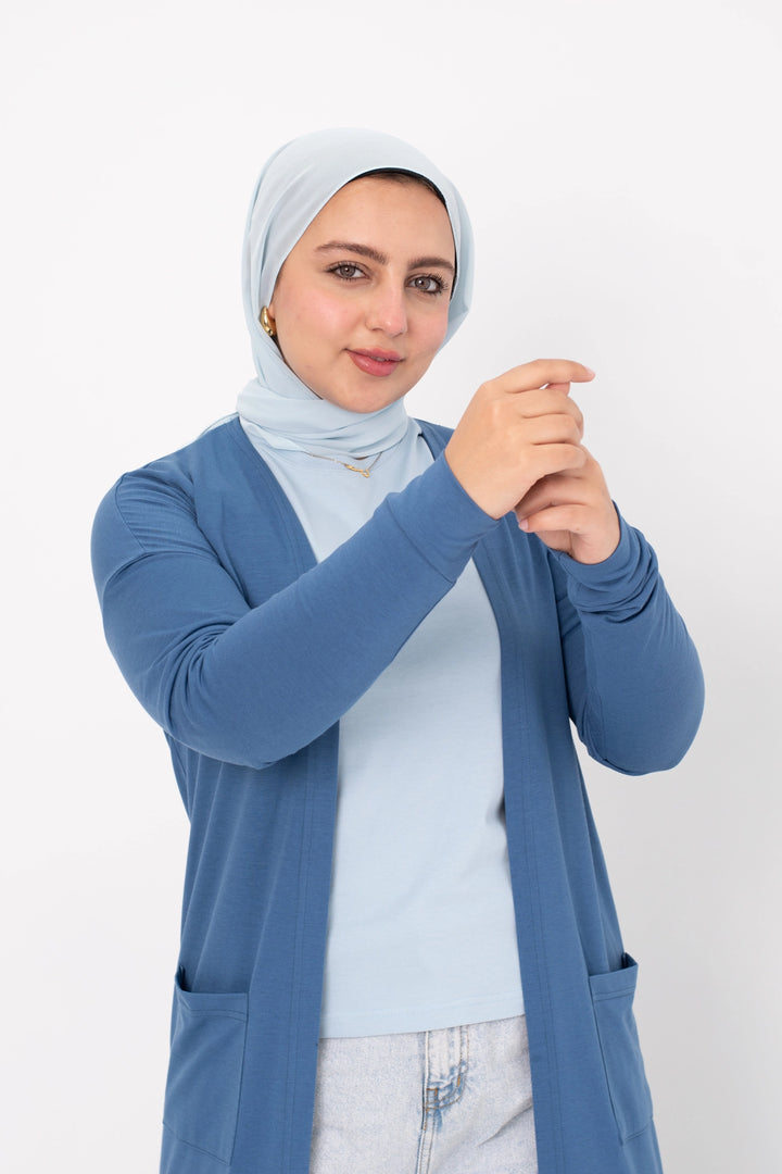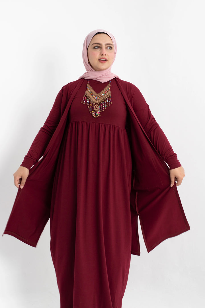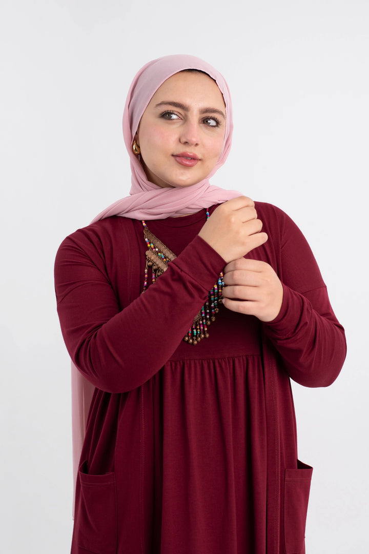 كاردجان طويل قطن كم طويل في نهايته اسوره وفي فاتحتين علي الجوانب وبه جايبين خامته قطن به نسبه ليكرا خفيفه